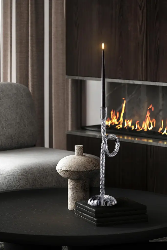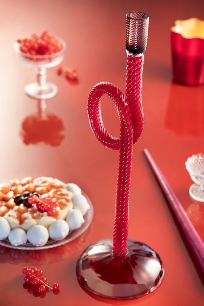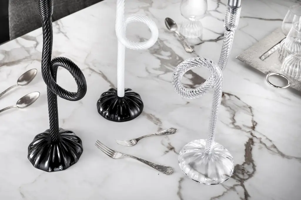 Venetian Knot Murano Glass Candleholder by Aina KariOne Of A Kind.Dimensions: D 13 x H 45 cm. Materials: Murano glass.Aina Kari pays tribute to the Venetian Lagoon city, where the Knots and ropes are part of Venetian everyday life.This collection of candlestick holders gracefully captures the essence of Venetian life, as the intricate knots and ropes symbolise the everyday charm of the city. The design of Venetian Knots is a testament to the unparalleled craftsmanship of the renowned Murano glass artisans. Each candlestick holder showcases their exceptional skill and dedication, achieved through the delicate process of blowing and modeling the glass.Aina KariAfter working for different world-renowned brands in Italy and abroad, Marina Cighir embarked on a new project for the greater good, back in her beloved Treviso, next to Venice. An honest relationship with local artisans, Marina masterfully combines her diverse heritage to create a distinct and empowering style characterized by coherence, strength, and originality.ANOTHER POINT OF VIEWHer sculptural vases, decor lightings, and chandeliers are notable for their unexpected visual paradoxes, seamlessly blending Venetian artisanal expertise with contemporary poetry. This unique fusion results in pieces that are both timeless and modern, reflecting a deep appreciation for the past and the craftsmanship-rich-rich Italy while embracing the creativity of the present.SLOW DESIGNDeveloping new artifacts is not based on “just propose a newness for the sake of newness”, but only if linked to a project, a useful sharable collaboration with people and community. Each material requires distinct know-how, the final object is always a crossroads of workshops. Curved-blown glass, provocative marble stones, and “tamed” brass lose their natural hardness to become decorative objects.