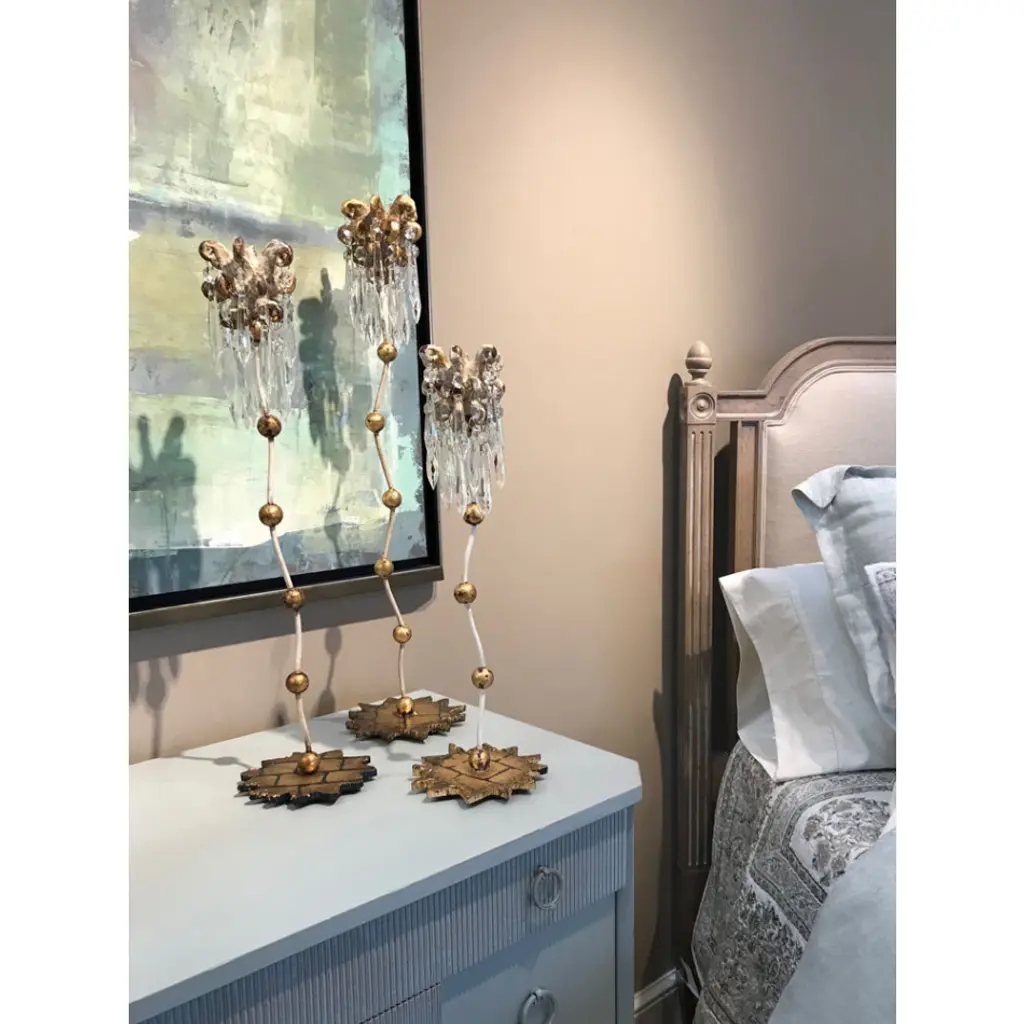 Striking a balance between whimsical Chic and Modern Charm, this 23 Inch tall candle stick uses painted wrought iron with decorative breaks and a unique sculpted bobeches to accent your dining, kitchen or breakfast nook. Using faceted crystals and blending perfectly with other accessories, our Venetian Candlestick shows off its inspiring European flair, and will allow for multiple uses in your space.