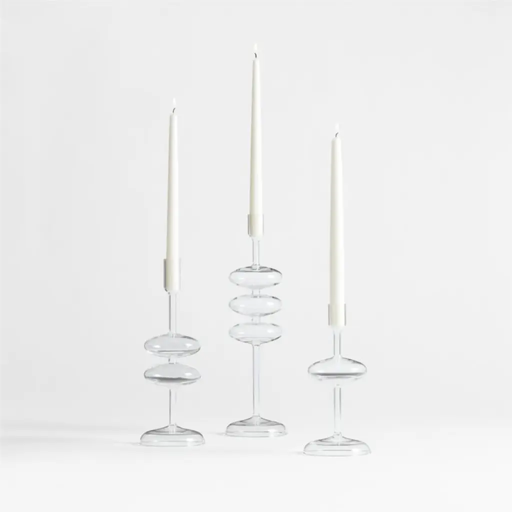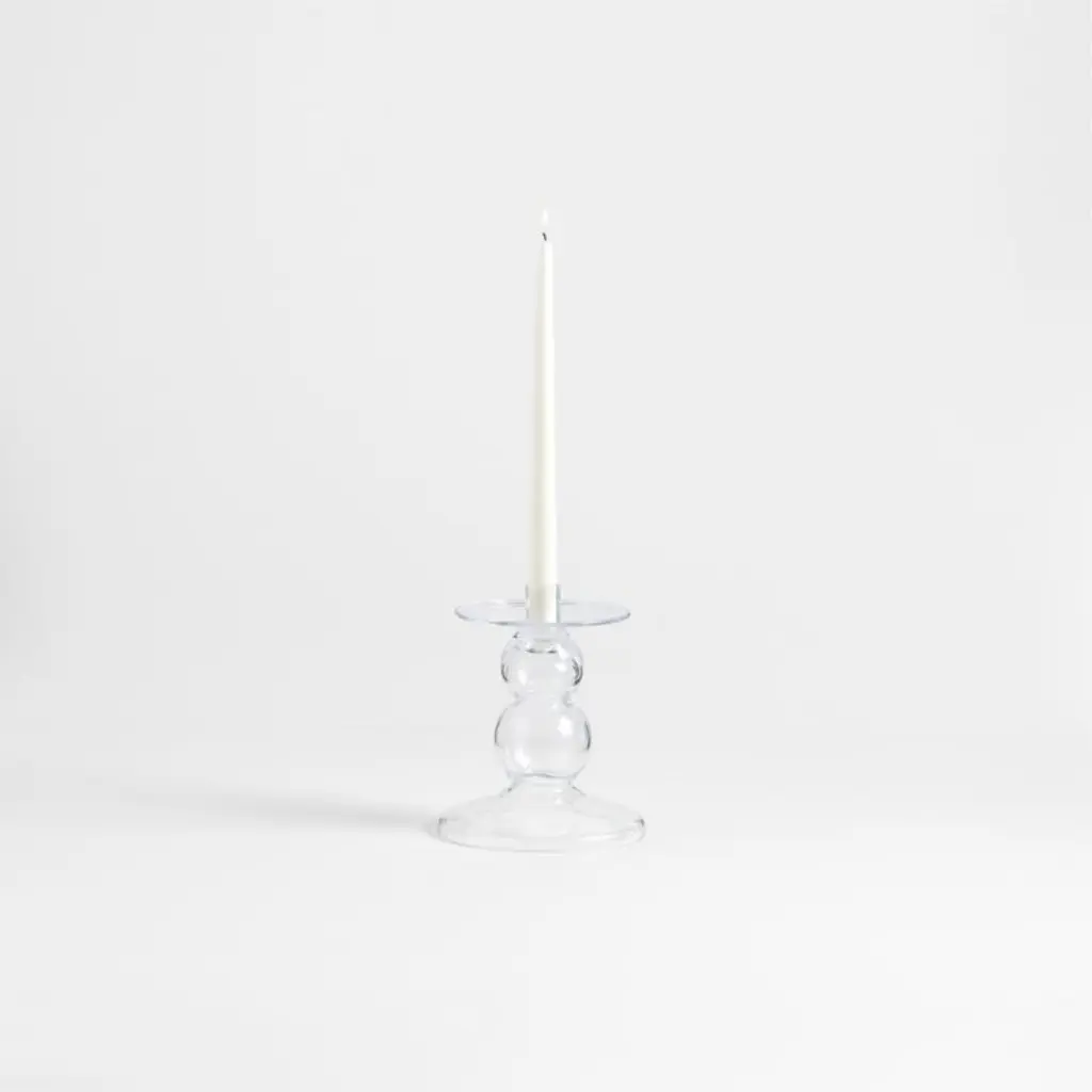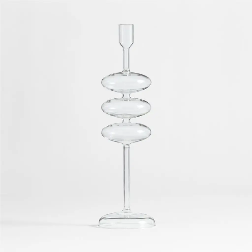 Inspired by mid-century modern glassware, our Venezia candle holders support elongated bubbles on slender stems for a sculptural yet playful silhouette. Crafted of clear glass, this large candlestick supports a taper or doubles as a bud vase. We love to layer botanicals with candlelight in a bountiful display. Mix and match our exclusive Venezia candle holders in various heights and hues to create an extravagant effect on your dining table or mantel.
