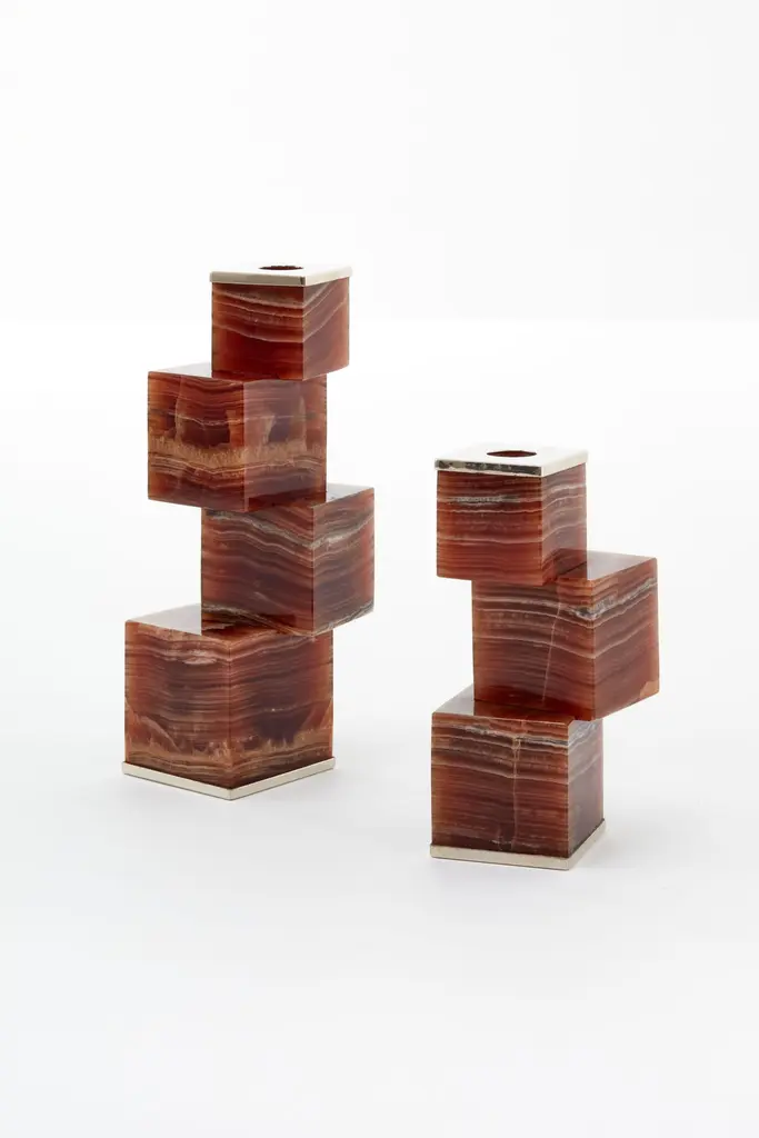 A composition of onyx with alpaca metal. Inspired by the pure and essential lines of a structure of solid stones, with a vertigo stability.Our pieces are made by hand. One of a kind.All natural stones may vary in color.