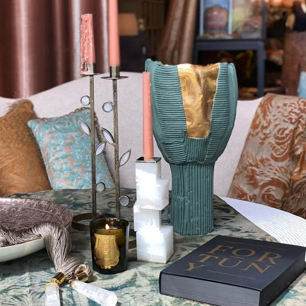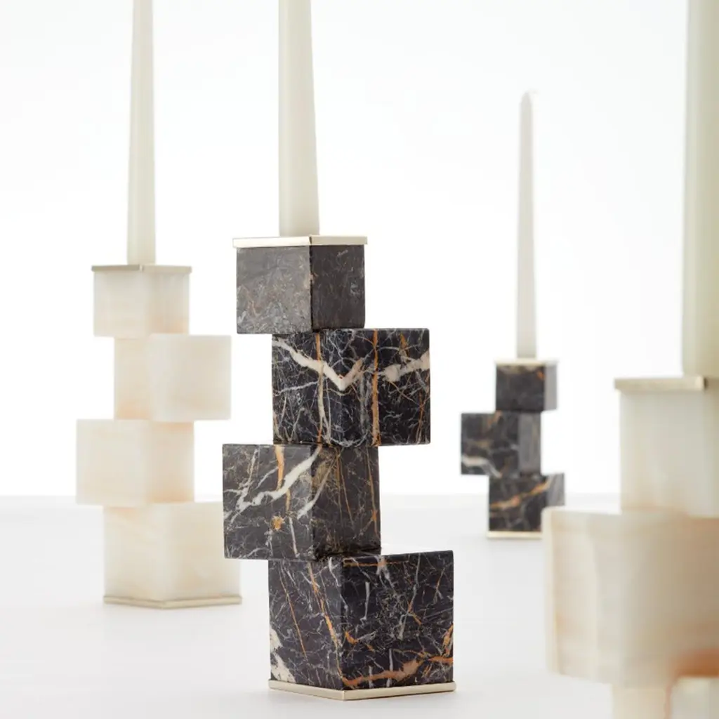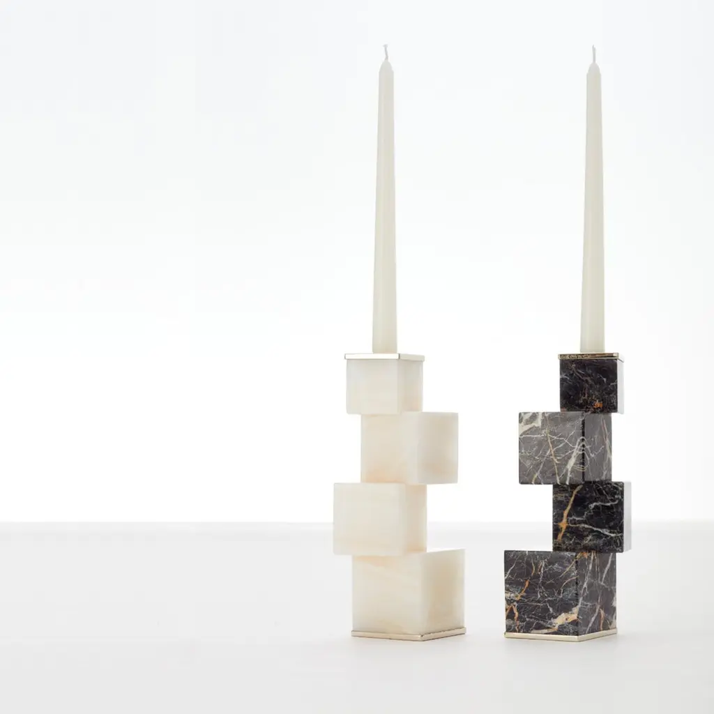 A composition of onyx with alpaca metal. Inspired by the pure and essential lines of a structure of solid stones, with a vertigo stability.Our pieces are made by hand. One of a kind.All natural stones may vary in color.