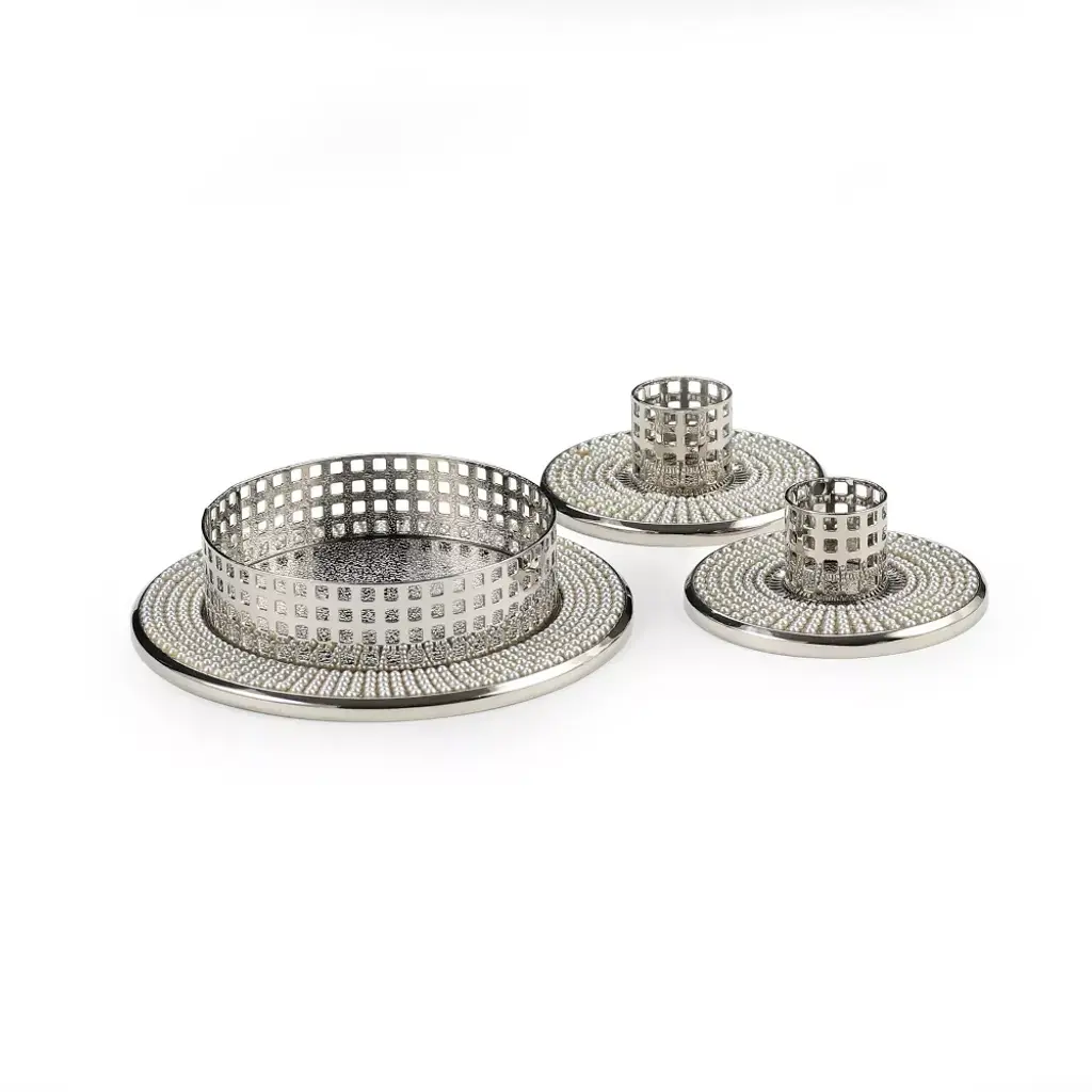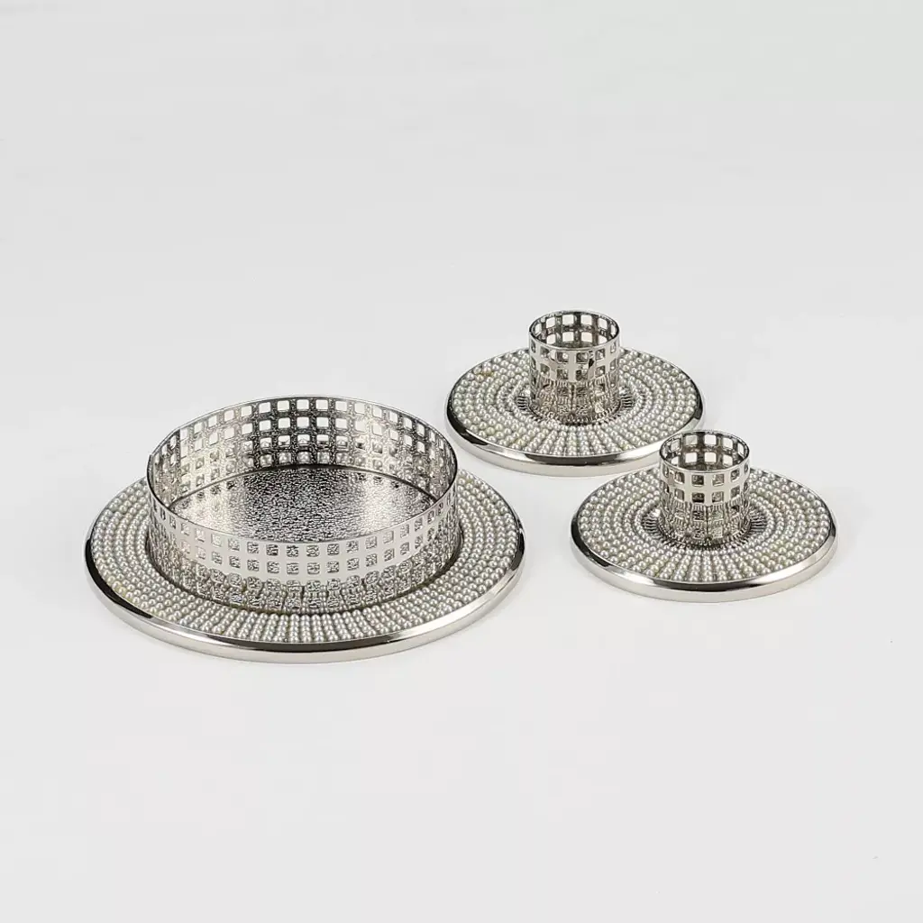 Bring classic glamour to your unity ceremony with this Vintage Pearl Wedding Collection Unity Candle Stand Set from Hortense B. Hewitt. This unity candle stand set includes two small stands designed to be held by the bride and groom, with one larger stand designed to hold the unity candle. Each piece in this silver candle stand set features nickel plating with vintage pearl accenting — bringing functional style and timeless elegance to your ceremony. After your special day, use this vintage pearl candle stand set as a home decor piece — you'll be reminded of your everlasting love whenever you light the candles.