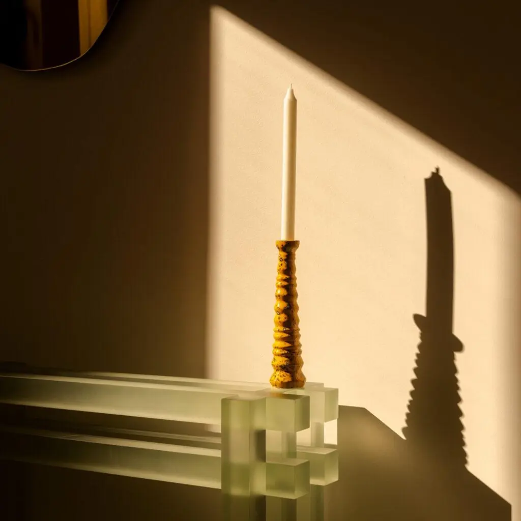 As a continuation to our one of a kind porcelain series, this limited edition yellowand turquoise glaze candle holder becomes an instant accent piece to your dinner table. This limited edition has been crafted by most meticulous artisans and each is unique in color and finishing creating a one of a kind piece.Style : VCC0101Material : clayDimensions : 25 height x 5 diameter cmColor : mustardLimited edition of 50.