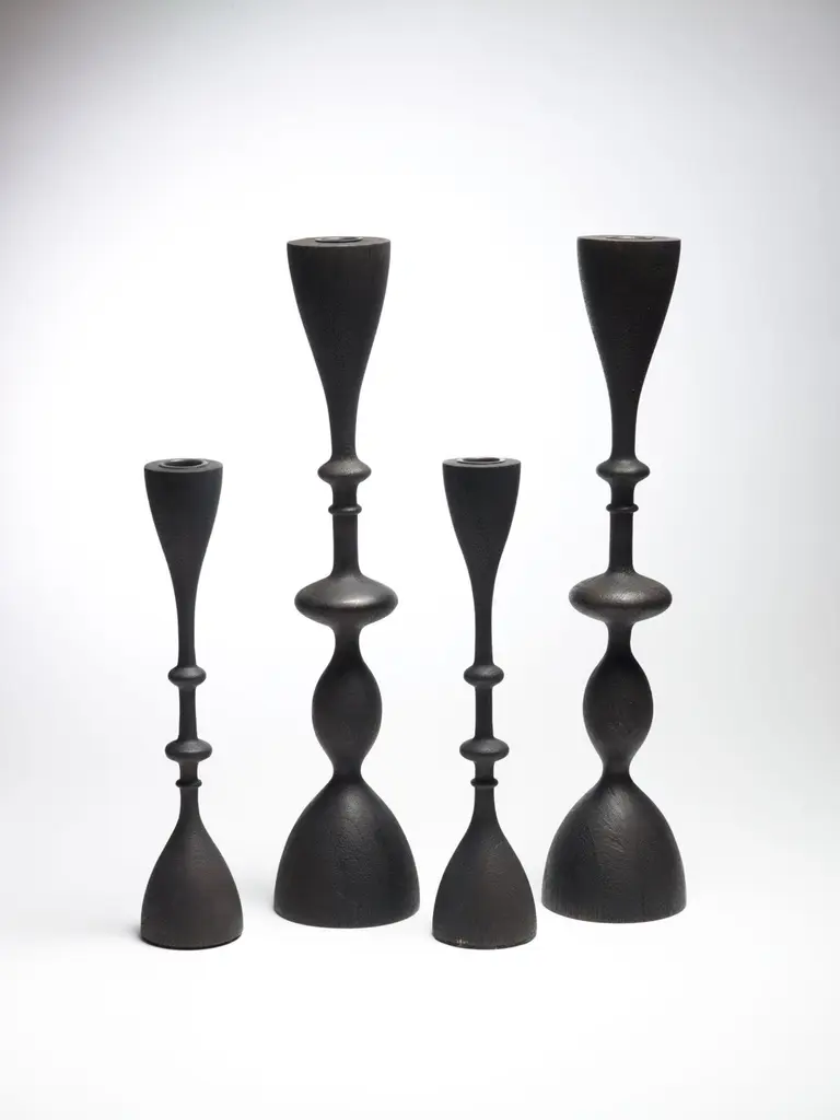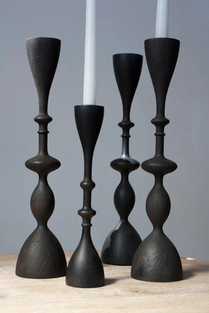 Hand-turned from sustainably harvested Mango wood, the Wave Candlestick draws its form from sinusoidal waves. Burned and oiled finish. Available in short (12") and tall (16"). Founded in 2011, AKMD developed out of a thirteen-year friendship and design collaboration between Ayush Kasliwal and Mike Dreeben.The two met in Jaipur, India in 1998: Dreeben had recently completed an MFA in sculpture at the University of Chicago and was working on a Fulbright grant, studying vernacular woodworking; Kasliwal had just completed study at the prestigious National Institute of Design in Ahmedabad, with a degree in furniture design. What they found was a mutual interest in fine craft practices and how these could inform contemporary design. This has become a driving concept behind the AKMD collection.Both Kasliwal and Dreeben are makers and their design approach begins with a deep understanding of the inherent characteristics of material and of production method — allowing process to drive design, rather than the other way around. Their work is pragmatic and honest: the materials are presented straightforwardly, as are the mechanical connections that bind the pieces together. Their furniture is notably free of veneer and plastics, that don't provide the kind durability that one can expect from solid wood, cast metal, or saddle leather And although everything they offer is meticulously crafted, their pieces are comfortable and unfussy — pieces that you can live with, that will respond positively to use and age by developing a patina that reflects their history in one's home.