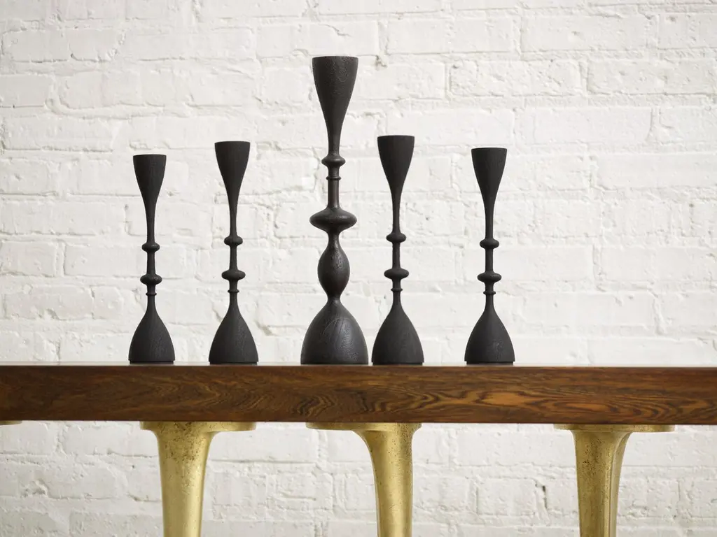 Hand-turned from sustainably harvested Mango wood, the Wave Candlestick draws its form from sinusoidal waves. Burned and oiled finish. Available in short (12") and tall (16").Founded in 2011, AKMD developed out of a thirteen-year friendship and design collaboration between Ayush Kasliwal and Mike Dreeben.The two met in Jaipur, India in 1998: Dreeben had recently completed an MFA in sculpture at the University of Chicago and was working on a Fulbright grant, studying vernacular woodworking; Kasliwal had just completed study at the prestigious National Institute of Design in Ahmedabad, with a degree in furniture design. What they found was a mutual interest in fine craft practices and how these could inform contemporary design. This has become a driving concept behind the AKMD collection.Both Kasliwal and Dreeben are makers and their design approach begins with a deep understanding of the inherent characteristics of material and of production method — allowing process to drive design, rather than the other way around. Their work is pragmatic and honest: the materials are presented straightforwardly, as are the mechanical connections that bind the pieces together. Their furniture is notably free of veneer and plastics, that don't provide the kind durability that one can expect from solid wood, cast metal, or saddle leather And although everything they offer is meticulously crafted, their pieces are comfortable and unfussy — pieces that you can live with, that will respond positively to use and age by developing a patina that reflects their history in one's home.