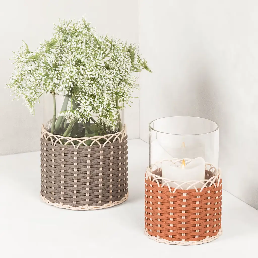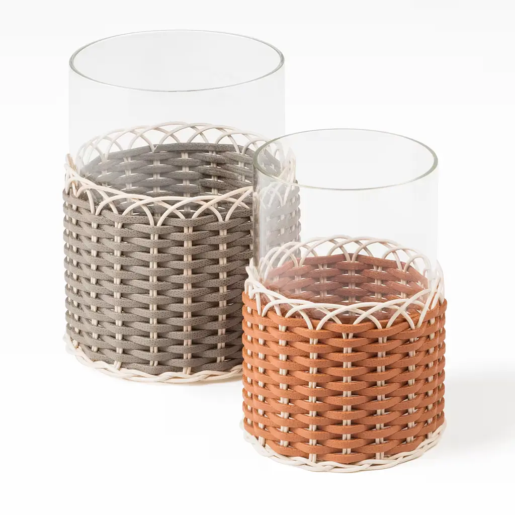 Candleholders made of transparent borosilicate glass and partially covered in woven leather and rattan. Can be used as vases. Only available with natural rattan combined with golf or nappa leather.