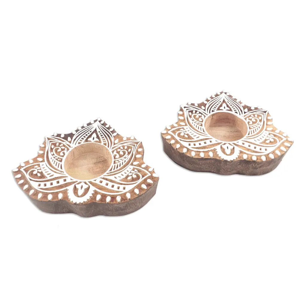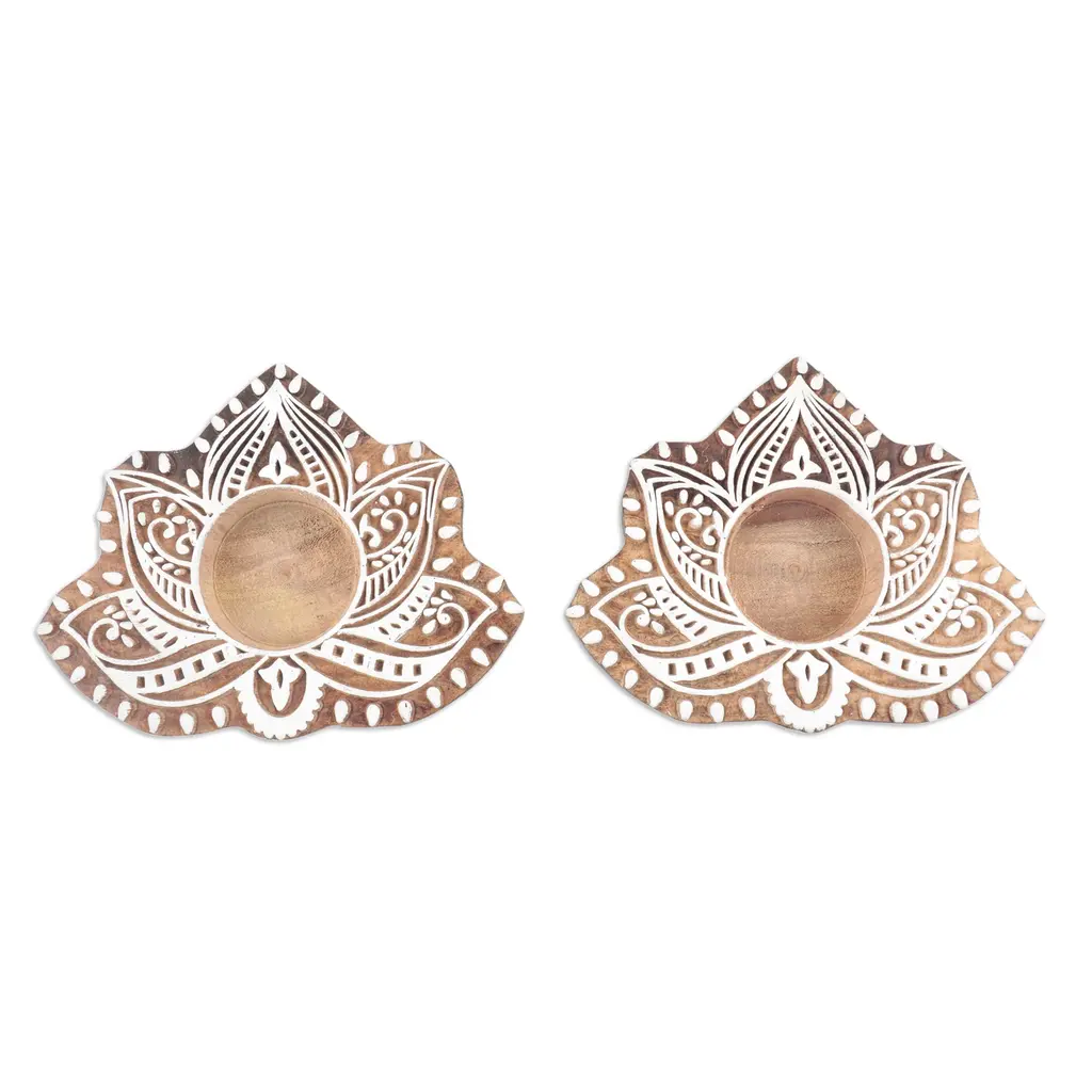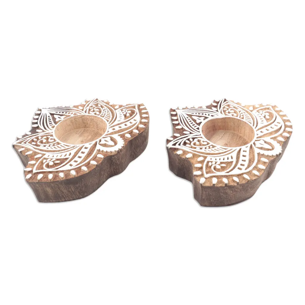Wood Tealight Candle Holders With Lotus Motif (Pair)- Kindled Lotus