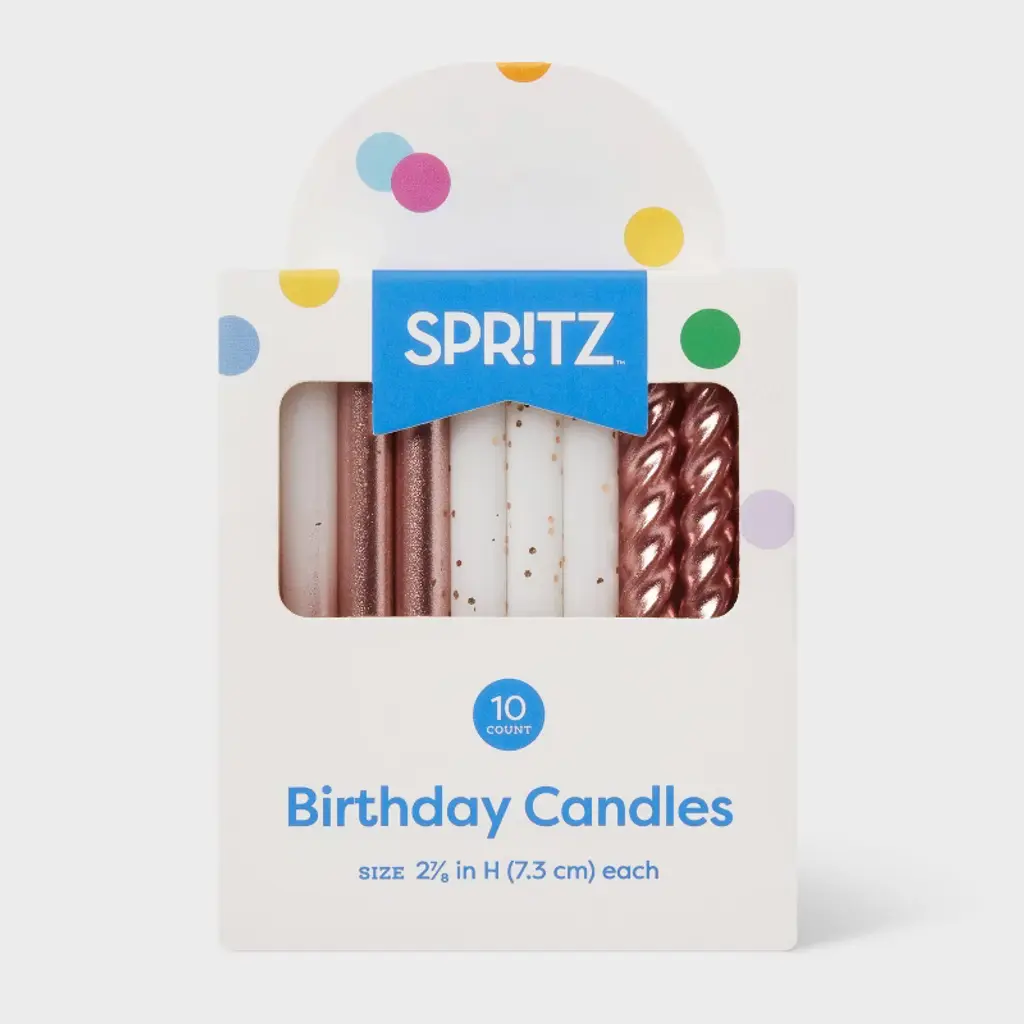 Illuminate your celebrations in style with the 10ct Rose Gold Assorted Candles from Spritz™. These candles feature striking assorted designs in a rose gold finish to add some shimmer to your cake or dessert table, enhancing the ambiance of your celebration. Crafted from wax, the 10ct rose gold assorted candles from Spritz™ burn evenly and add warmth to your gathering.Spritz™: Pops of joy that make the moment™
