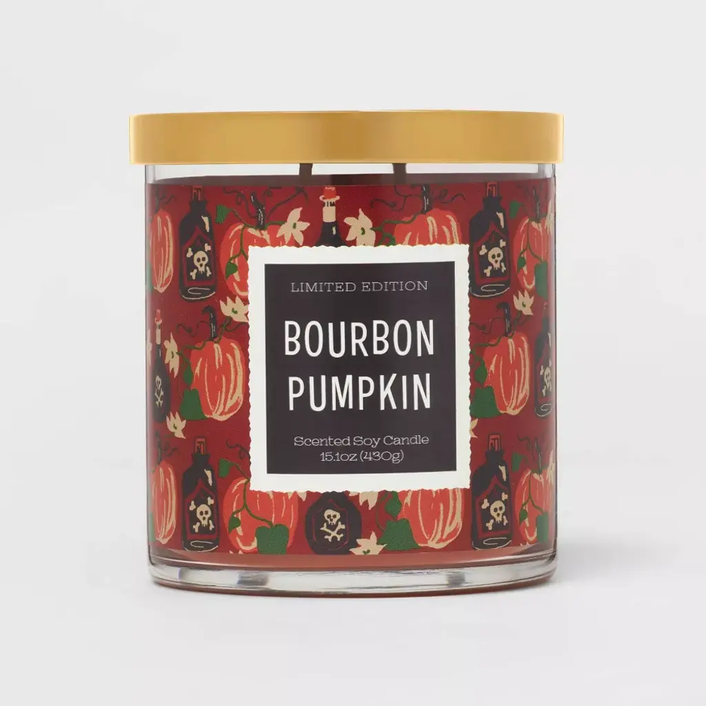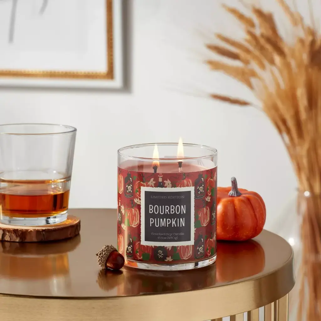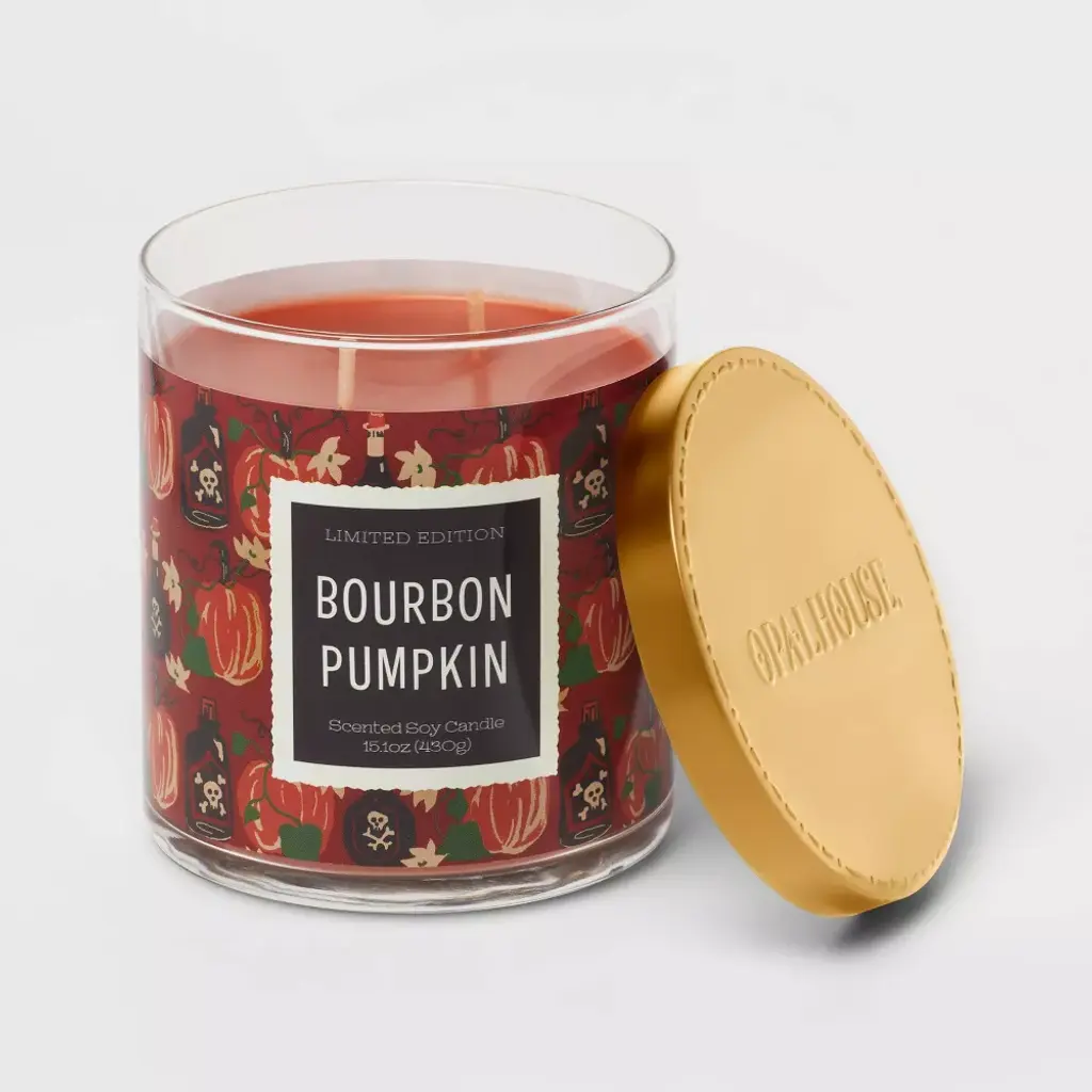 Create a refreshing ambiance for autumn celebrations with the 2-Wick Lidded Glass Jar Bourbon Pumpkin Candle from Opalhouse™. Made with soy wax, this round glass jar candle features an illustration of pumpkins, skulls on bottles and leaves for spooky appeal. The scented candle comes with a lid to help keep it covered when not in use, and provides a burn time of around 50 hours. Opalhouse™: Inspired Spaces / Create spaces as bold as your spirit.