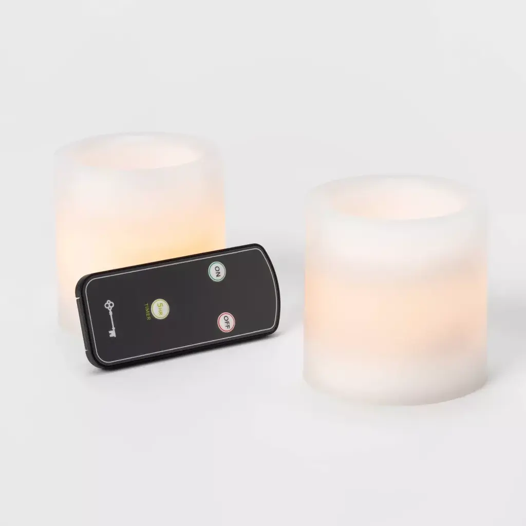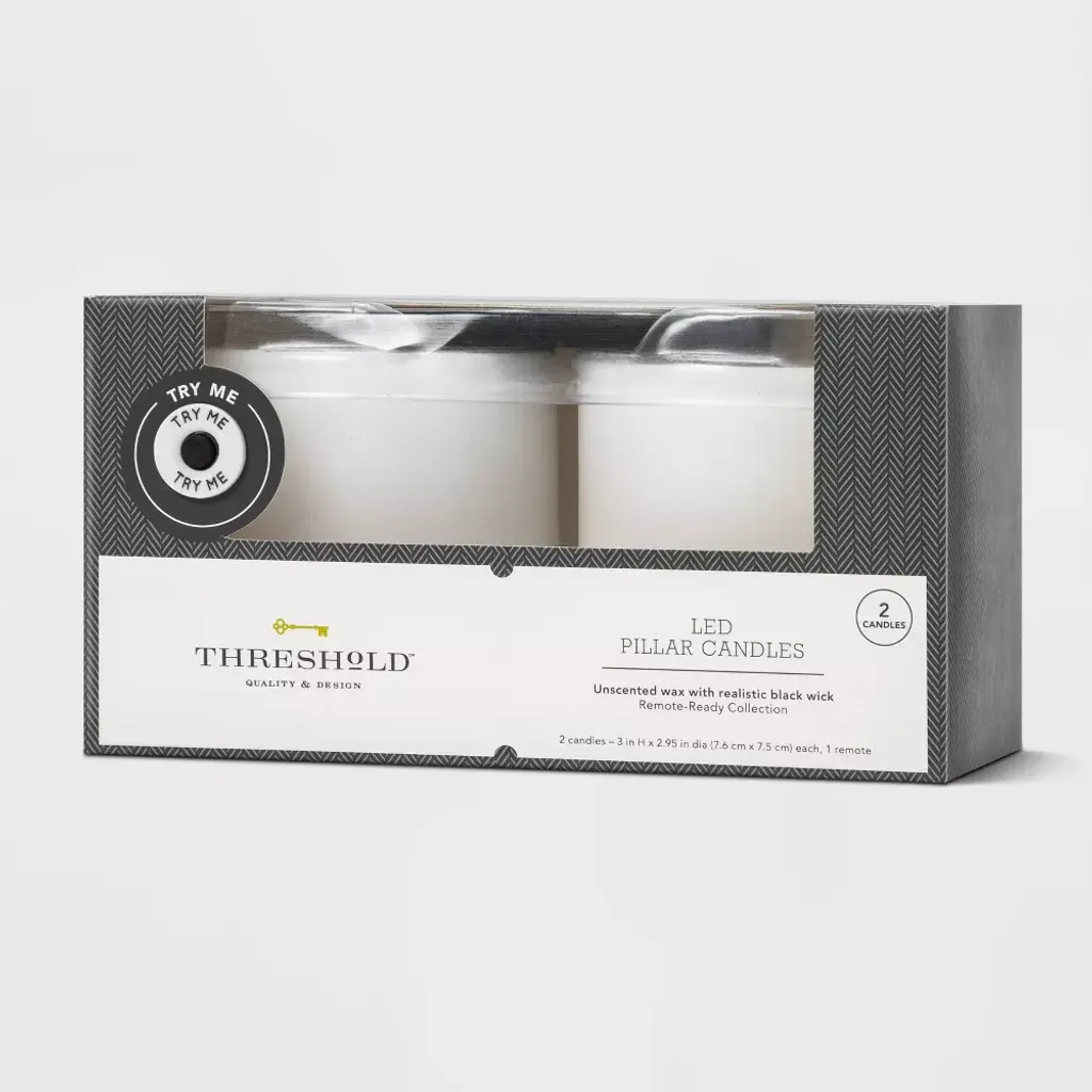 Make every day special by lighting up your home with this 2-Pack LED Flameless Black Wick Candles from Threshold™. These flameless candles are the same height and look like pillar candles, with an LED bulb inside each. Complete with a realistic black wick, this white candle set will add a warm and inviting touch to your decor. Pair with candles of different heights and mix in with other decorative elements.Threshold™: Quality & Design / Casual classics for house and home.