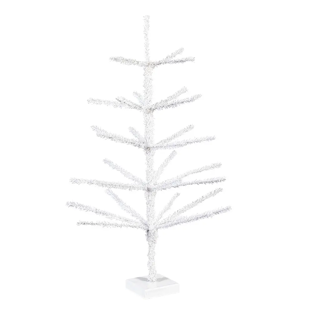 Get into the holiday spirit with this silver tinsel twig artificial Christmas tree. This eye-catching tree features a unique silver tinsel twig design that is sure to stand out in any space. With its clear LED lights the tree adds a festive glow to your home making it perfect for decorating any room or adding a touch of holiday cheer to your office. The pre-lit design means you won't have to fuss with stringing lights and the compact size makes it ideal for smaller spaces. Bring some holiday magic into your home with this beautiful and festive tree. Product Features. : Pre-lit with 150 warm white LED rice lights. "Warm white" also known as "warm clear" has a soft natural incandescent glow similar to candlelight. Bulb size: micro fairy. 178 tips. 0.50" wide tips. 4" lead cord. Bendable wire branches. Medium profile tree. "Trunk" pole is wrapped in matching silver wire. Additional Product Features: LED lights use 90% less energy. Cool to the touch. If one bulb burns out the rest will stay lit. For indoor use only. 2-piece assembly (includes stand). Non-replaceable bulbs. Comes with a FREE silver metal tree stand. Requires (3) 'AA' size batteries - not included. Convenient on/off switch with timer function. Timer function has 8 hours on 16 hours off. Dimensions: 3' high (from the base of the stand to the top of the tree). 28" base diameter (at the widest point). Material(s): tinsel/metal/wire/plastic bulbs