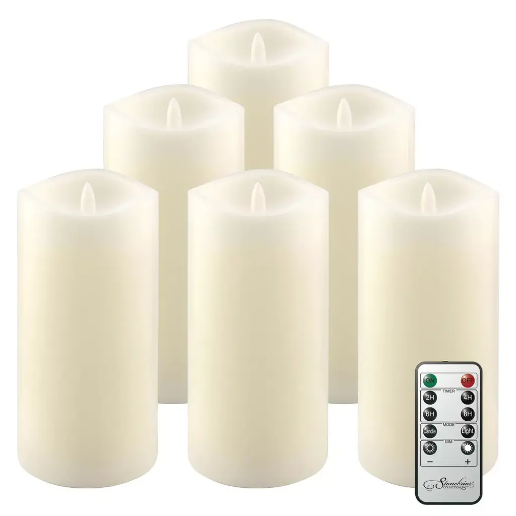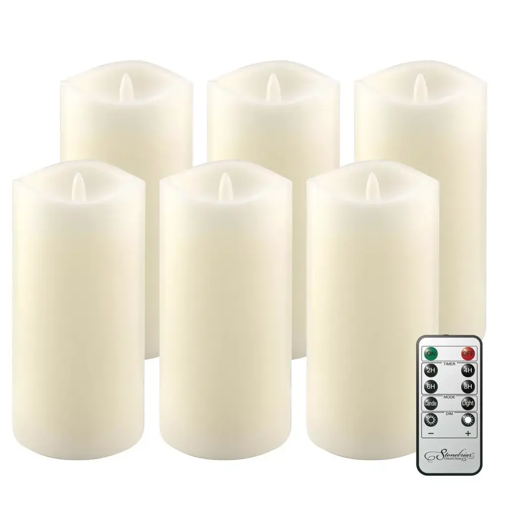 Never worry about leaving a candle burning in your home again with Stonebriar's 6pk 3x6 real wax flameless pillar candle set. These flameless candles are made with a real wax casing, sculpted top and flickering flame shape light to give the feel of a real burning pillar candle. Don't like the flickering light of candles? No problem. You can also set your LED pillar candles on the "light" mode for a warm static glow. Candle set comes with a handy remote so you can set your candles on a 2, 4, 6, or 8 hour schedule. Candles are also dimmable, so you can adjust the brightness to create the perfect mood. Each candle requires 3 AAA batteries (not included). Use candles to create a relaxing spa ambiance, romantic restaurant setting, or brighten up weddings and parties without the worry. Buy your Stonebriar real wax LED candles today and brighten up any room in your home.