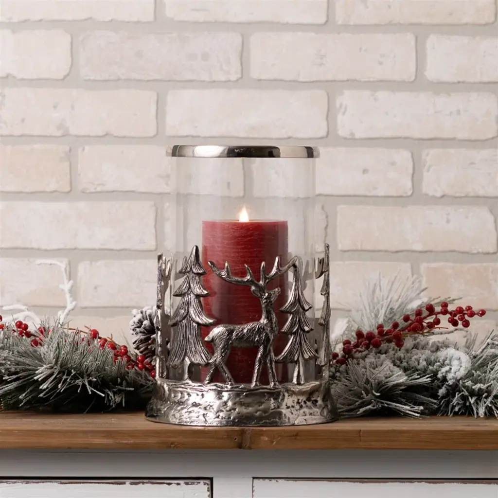 Add a touch of woodland style to your home with this etched metal candle holder. Measuring 11" tall, this piece is a great fit for your rustic or cabin lodge style of holiday décor. The etched metal design paired with the woodland deer and pine tree scene is the perfect combination to create a memorable holiday display. The quality glass and metal composition is sure to endure for seasons to come. Illuminate the display by adding a real wax or LED candle to the holder. Candles sold separately, this piece best fits a 4" or 5" pillar candle.