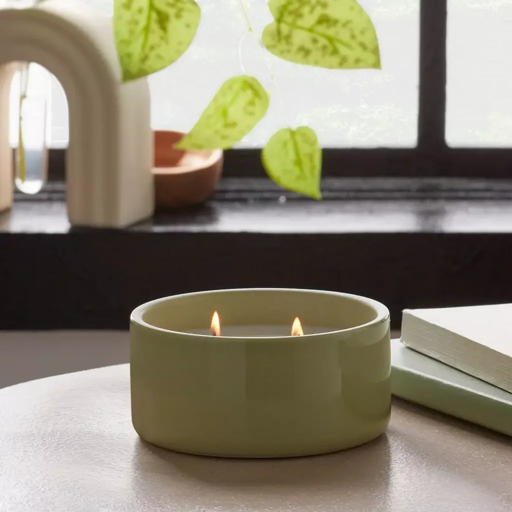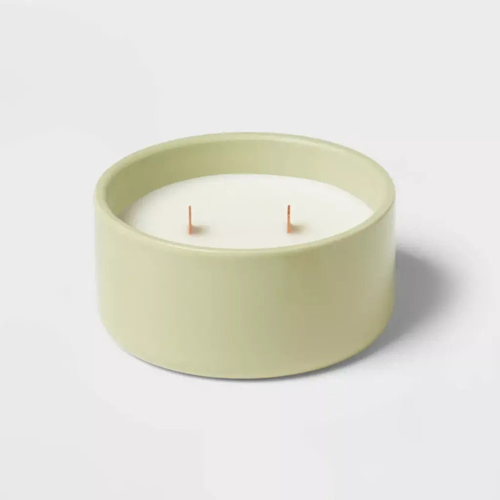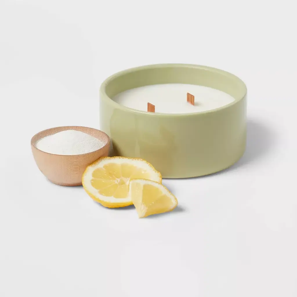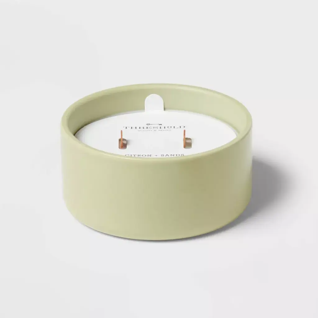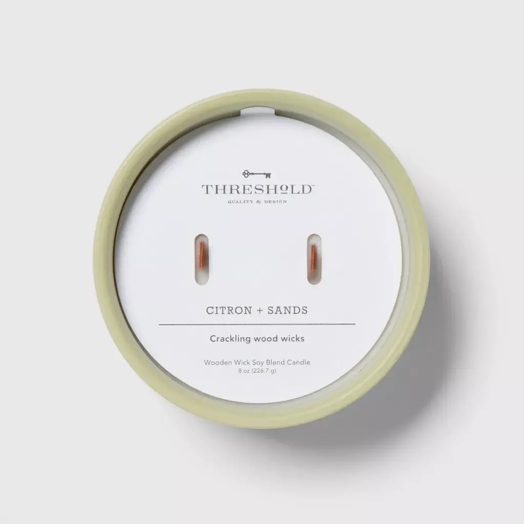 Enjoy a wonderful scent experience with the 8oz 2-Wick Glossy Ceramic Citron and Sands Candle Green by Threshold™. Scented with citron and sands, you can enjoy the summertime smell of beach bonfires anytime. Its glossy ceramic jar gives off a relaxing glow for an extra cozy atmosphere and the wooden wick makes a gentle cracking sound. Made from soy wax and paraffin wax, you can treat yourself to an amazing sensory experience with the glossy ceramic citron and sands candle by Threshold™. Casual classics for house and home.