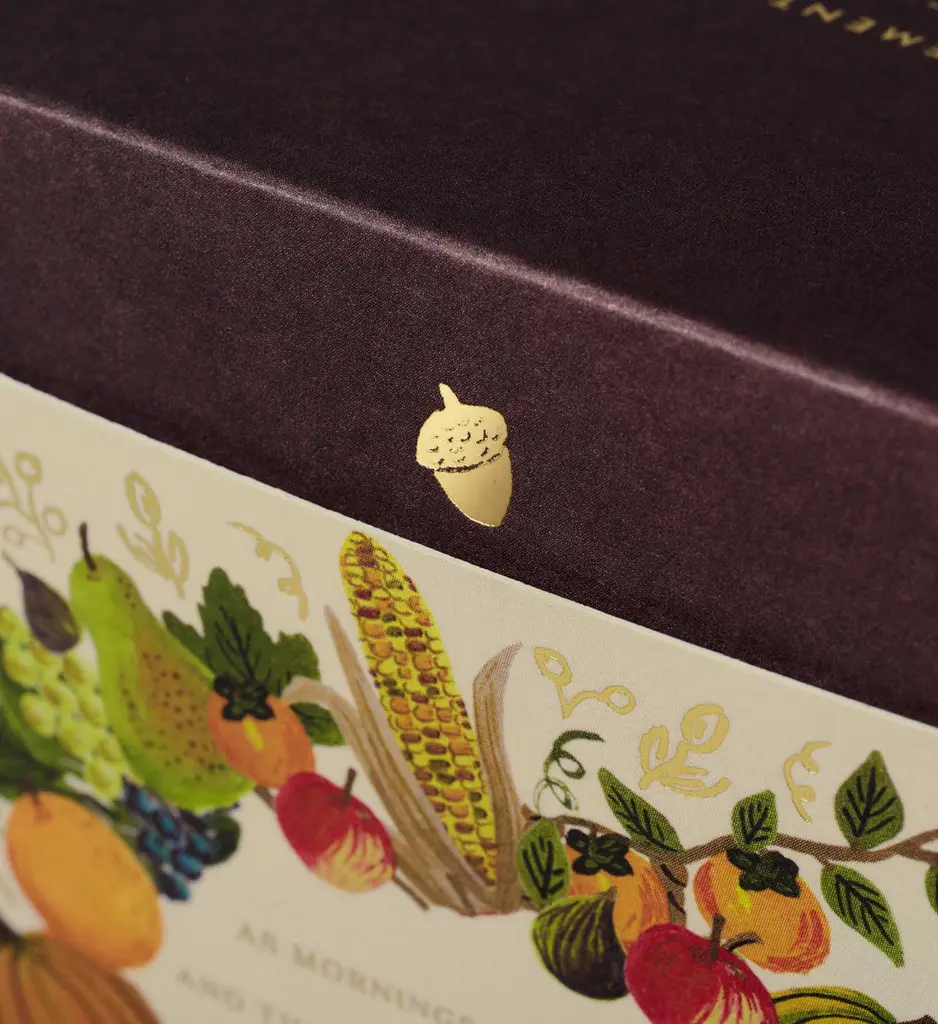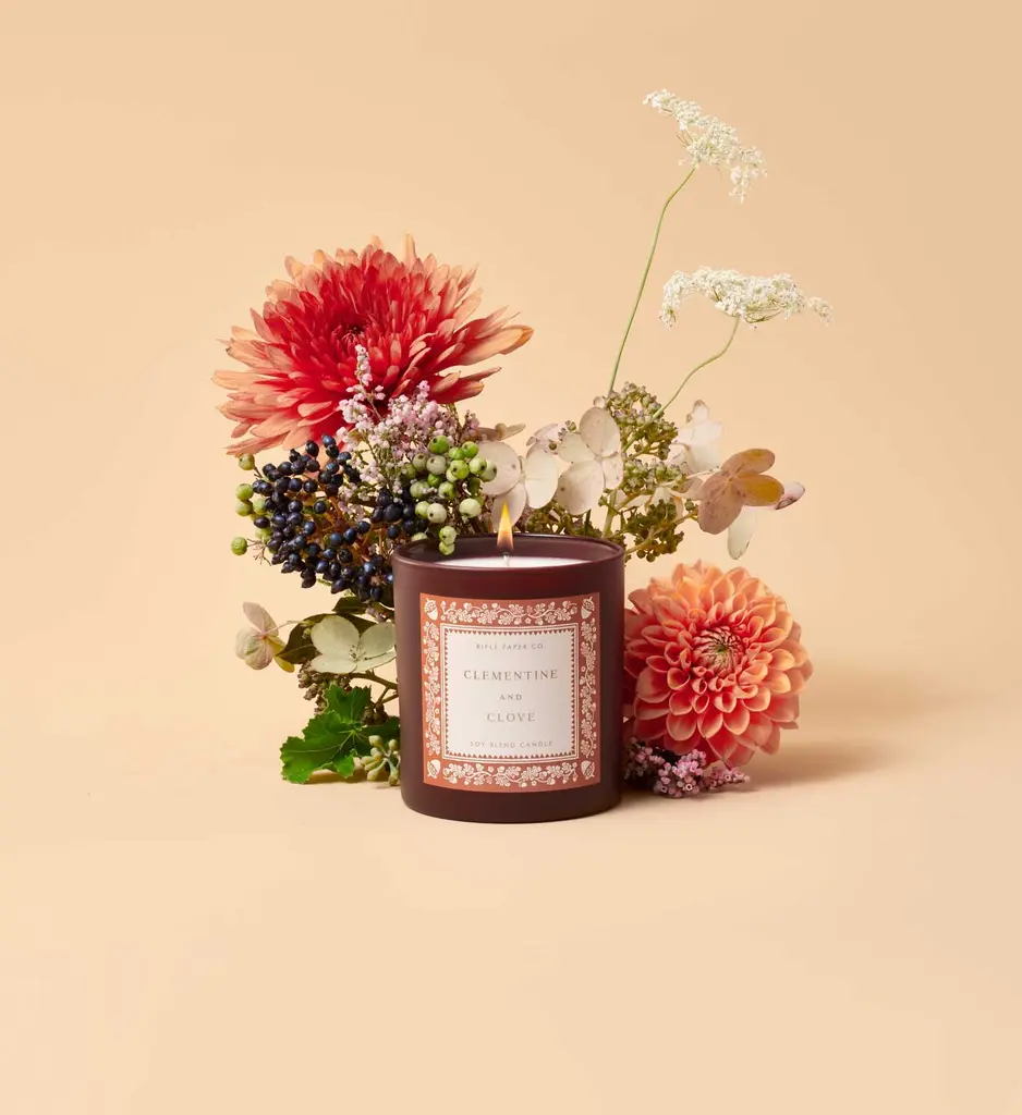 Warm and inviting, this autumnal scent features notes of clementine and clove. The 9.5 oz soy wax candle comes in a painted glass vessel and is packaged in a decorative gift box with gold foil accents.