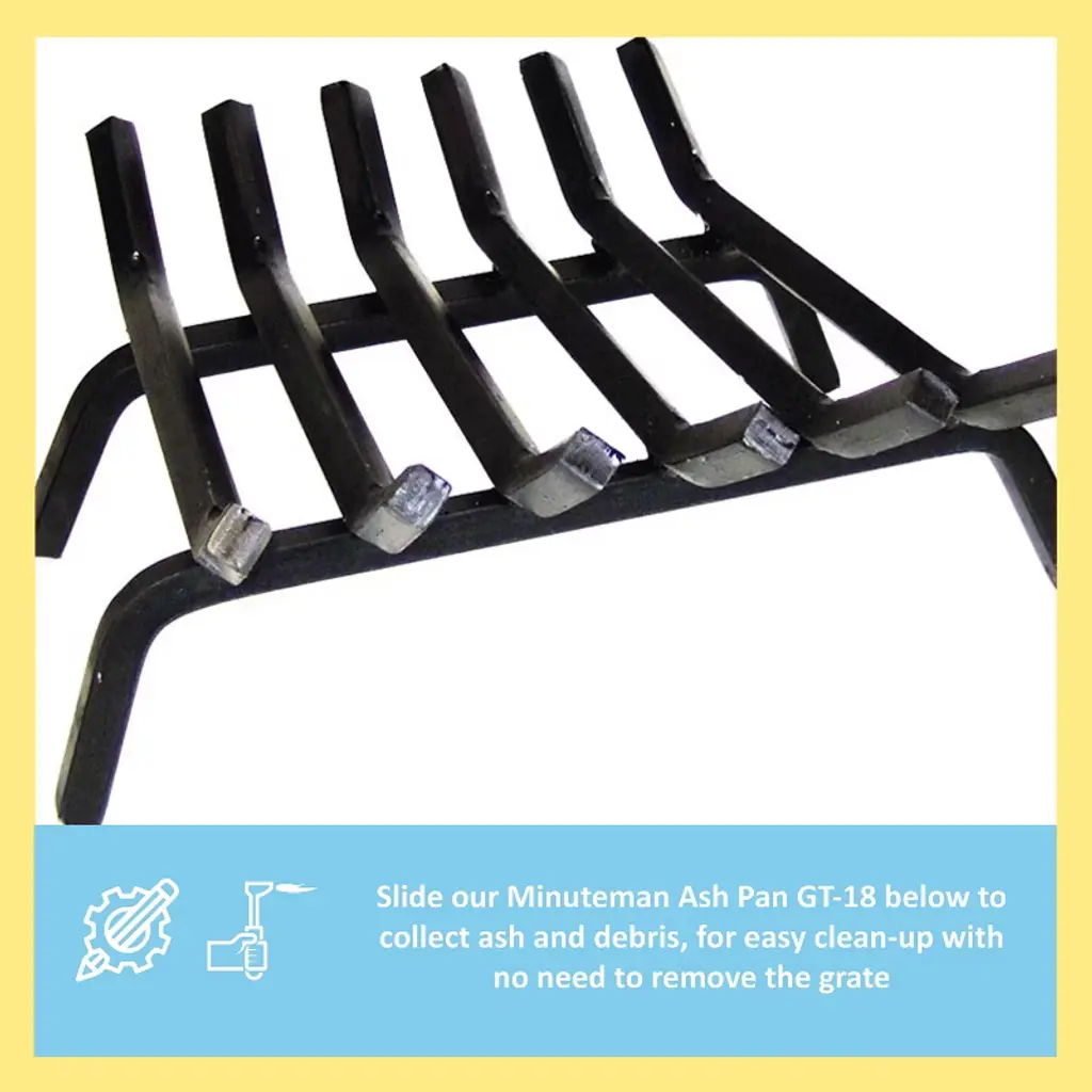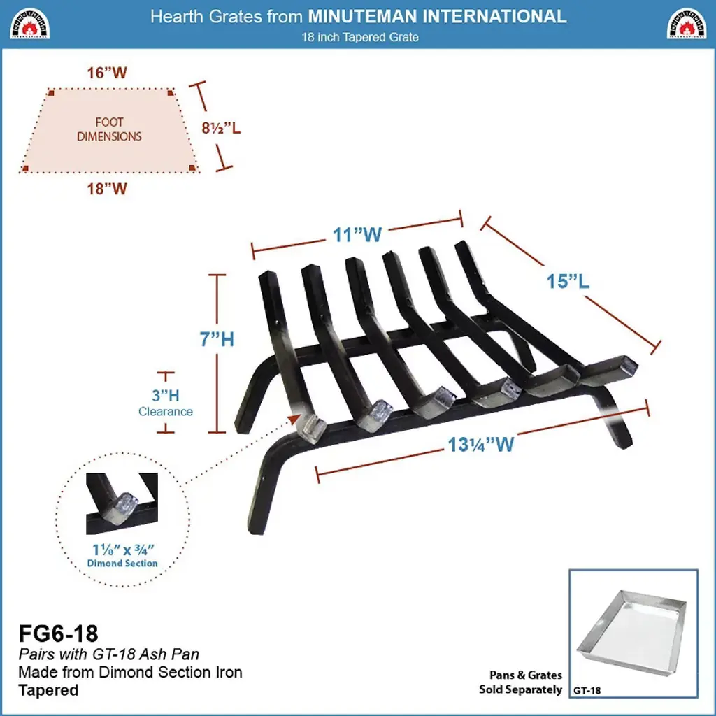 Keep logs supported in the fireplace with our sturdy Hearth Grates. Grates provide adequate air flow and allow ash to fall away for a clean and efficient burn. All Minuteman International grates are made from sturdy 1 1/8-Inch by 3/4-Inch diamond section for added strength and durability. Larger width grates feature an additional center support to prevent sagging in high heat. Slide one of our Minuteman Ash Pans below to collect ash and debris, for easy clean-up with no need to remove the grate. Choose from four standard sizes, two masonry sizes, and two non-tapered styles to fit fireplaces in older homes and new construction.