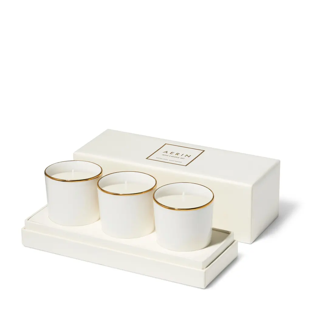 AERIN Mini Candle Trio in Cream. 3 x 2.1 oz filled votive-sized candles Wipe Vessel With Soft Damp Cloth
