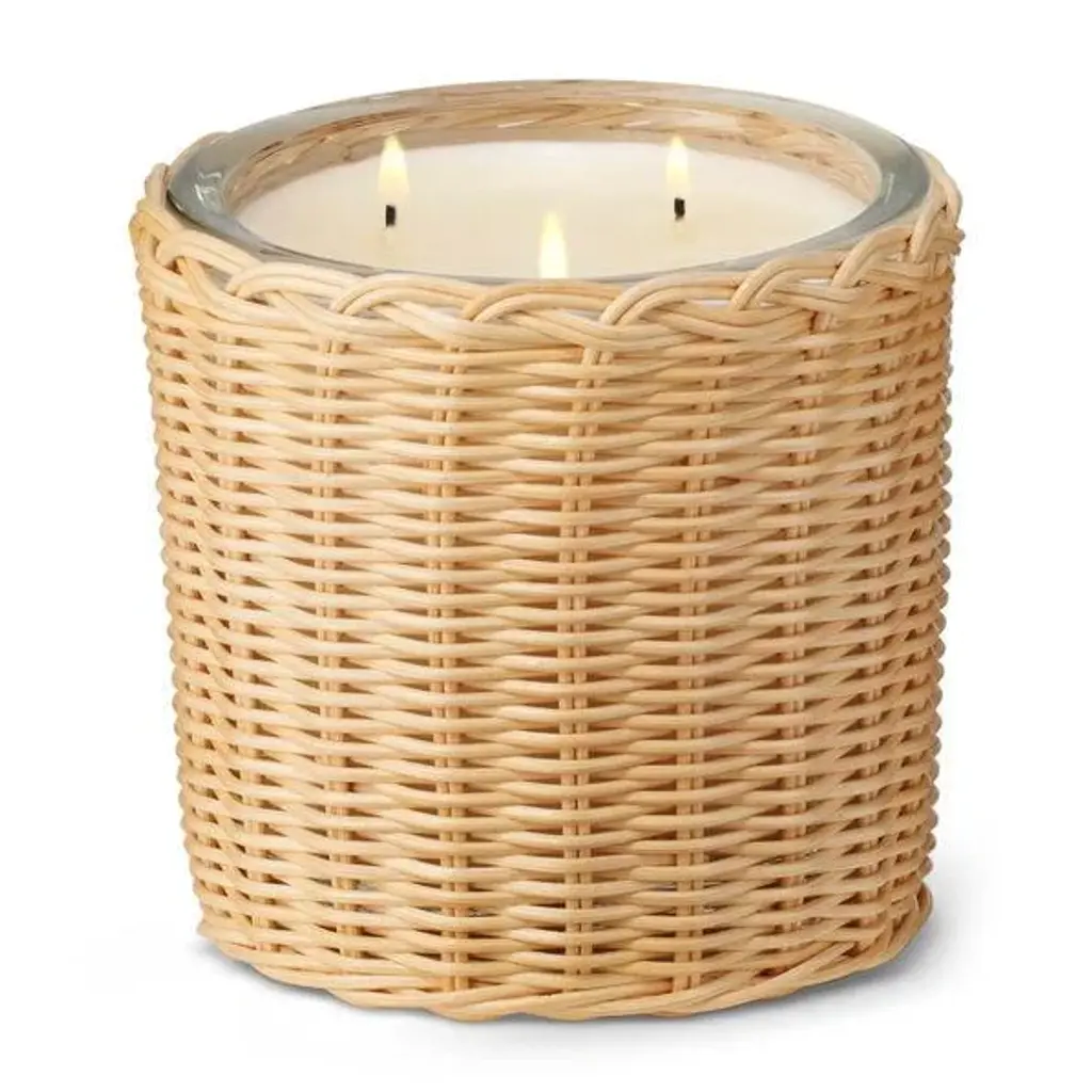 This two-wick scented candle imparts an uplifting floral fragrance. Presented in a woven wicker basket, it has a natural, rustic quality that adds warmth and coastal character wherever it is placed. Do not burn longer than 1.5 hours. Allow to solidify before relighting. Keep wick trimmed to 1/4”.
