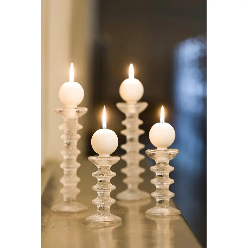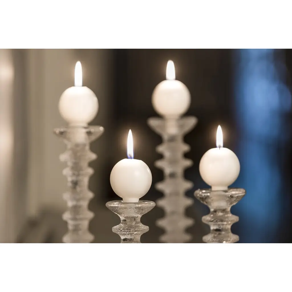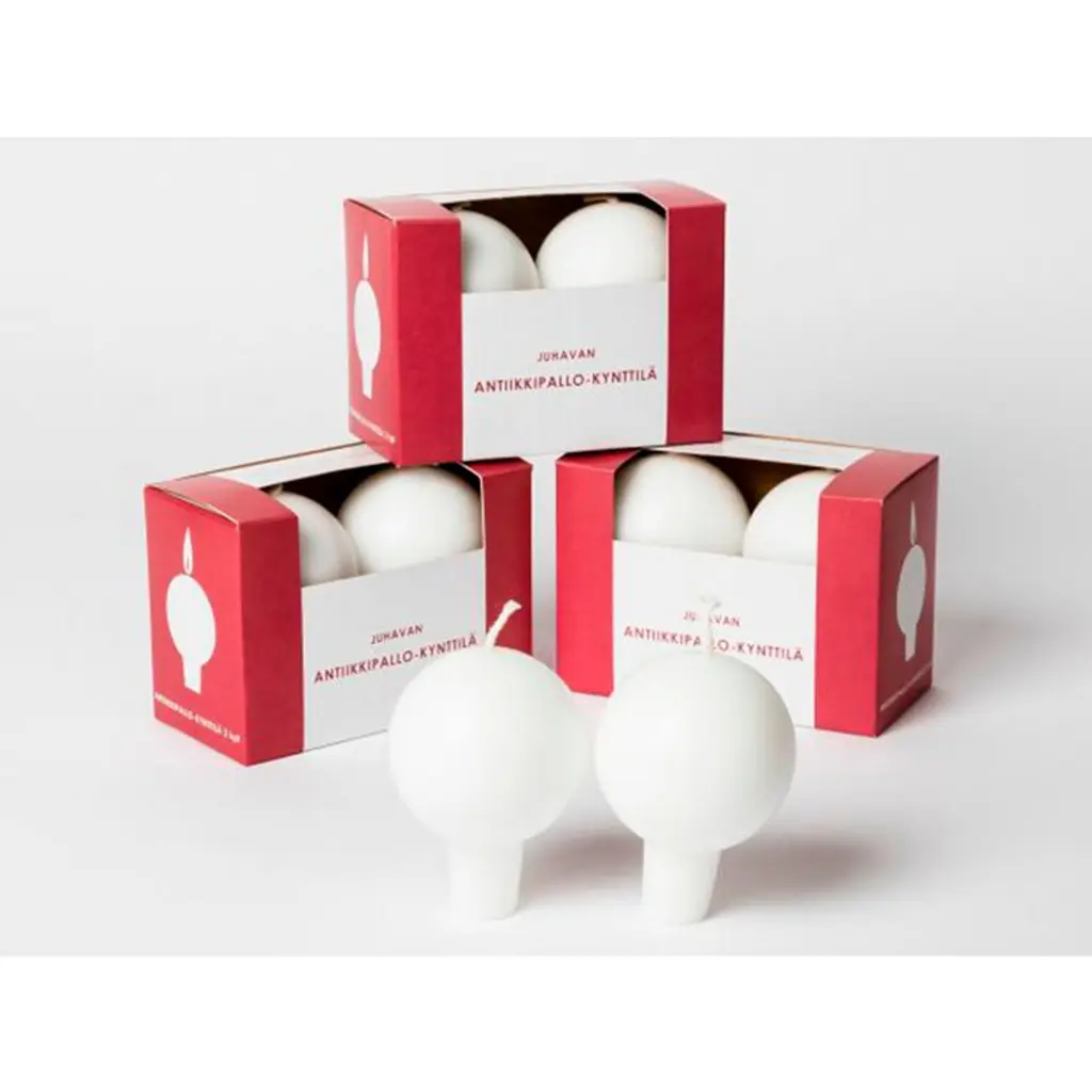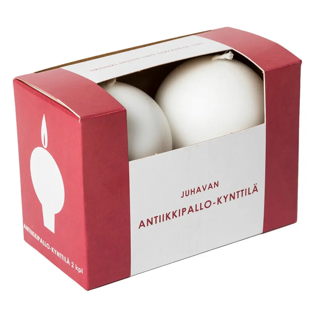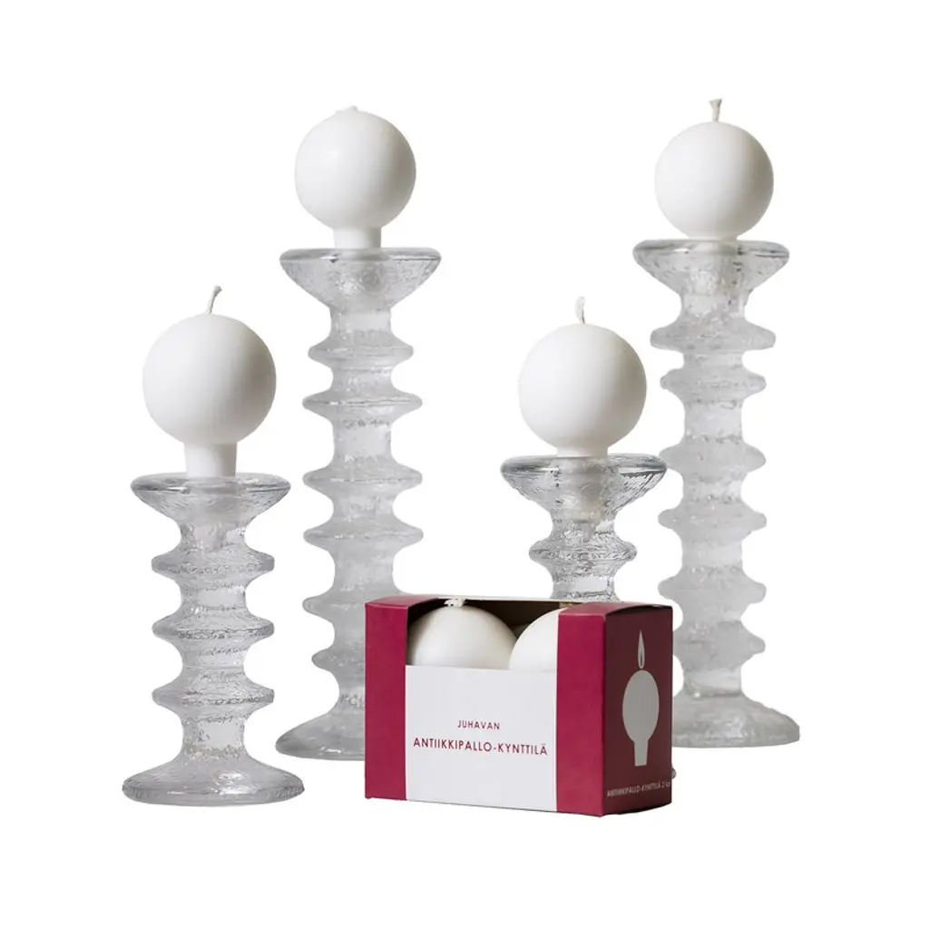 Juhava's antique ball candle is the original candle, designed by Timo Sarpaneva, for Iittala’s Festivo candleholders. The ball candle is equipped with a stem that holds it securely in place in the candleholder, be it Festivo or any other candleholder designed for taper candles. Juhava’s candles are handmade in Finland from pure 100% stearin, and thus do not contain impurities that could cause yellowing or sooting. Due to their high oxygen content, the candles burn with a large, clear flame. The antique ball candles are sold in a set of two.