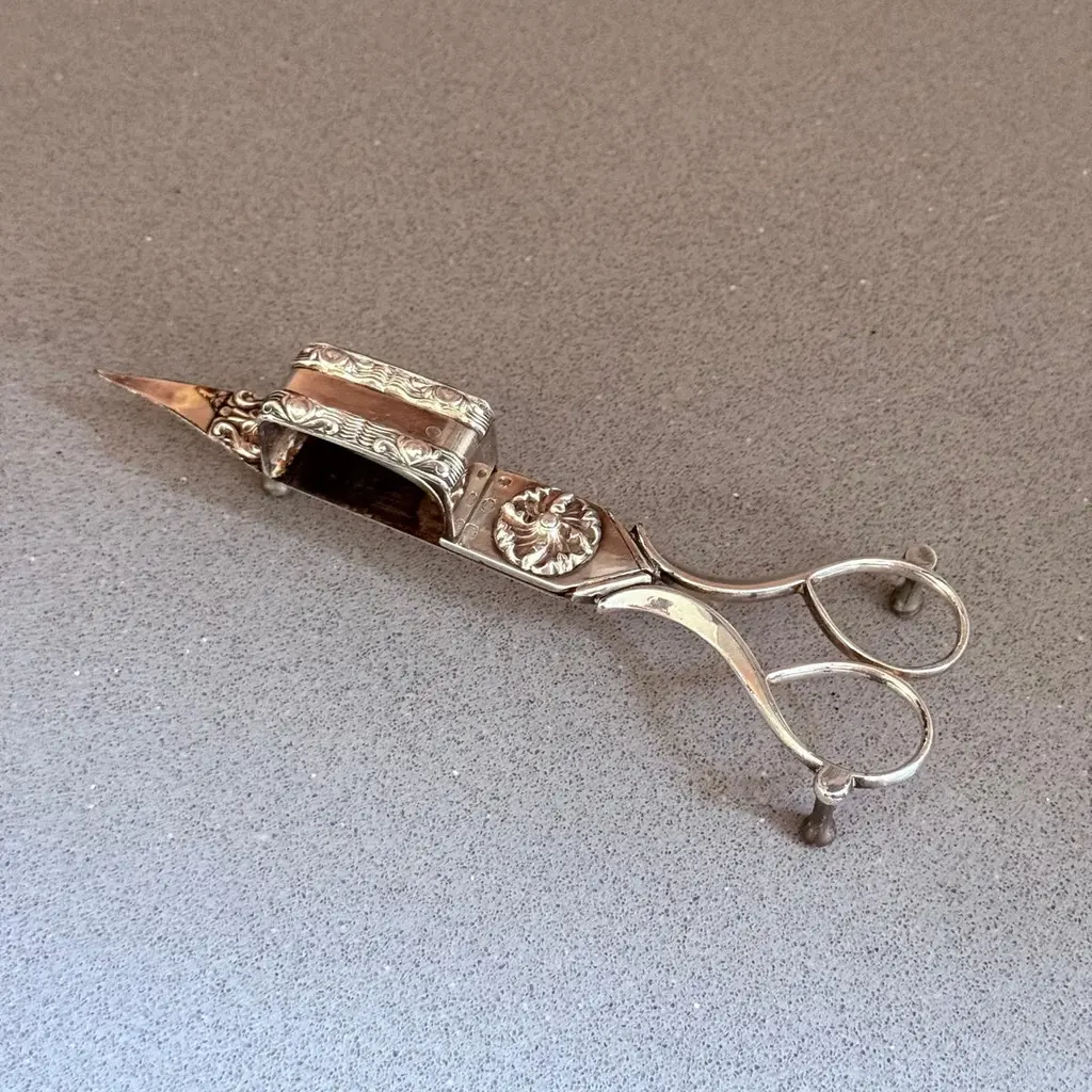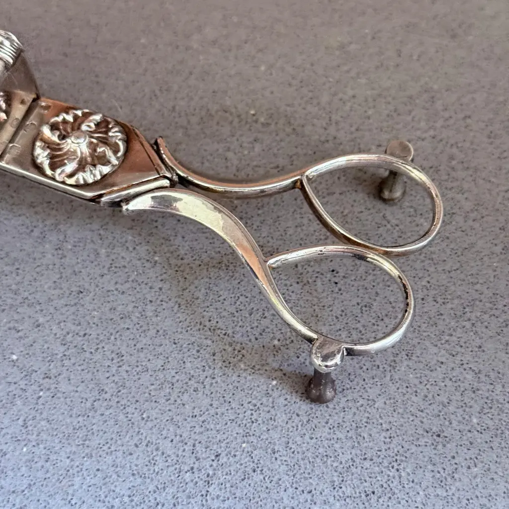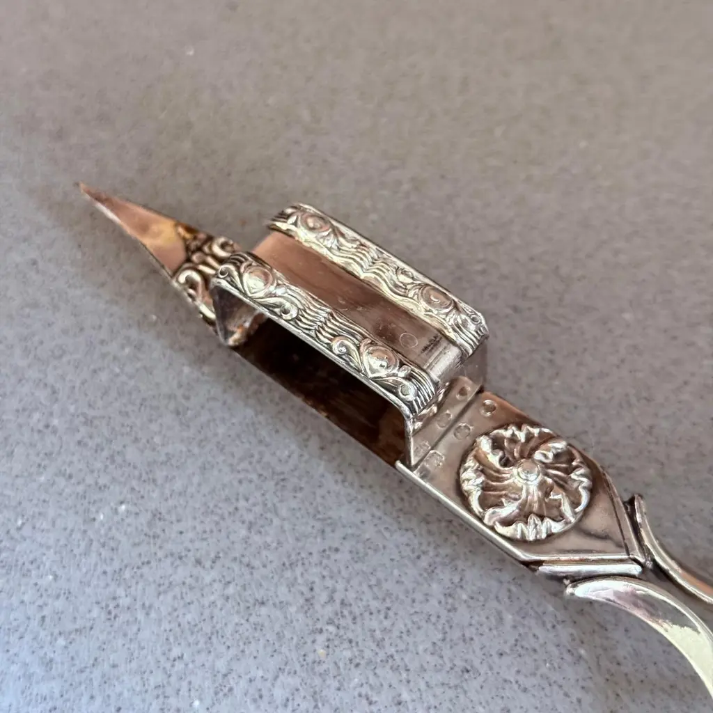 Antique Silver-Plated Candle Wick Trimmer Scissors, Victorian Table DecorAn exquisite antique silver-plated candle wick trimmer, showcasing elegant Victorian craftsmanship and timeless beauty. This rare scissor-style trimmer features intricate repoussé floral detailing, a decorative snuffer box, and gracefully curved handles a fine example of 19th-century metal artistry.Originally designed to trim candle wicks and collect burnt residue to maintain a clean flame, this trimmer remains both functional and decorative, making it a refined addition to any antique collection, mantel display, or luxury table setting.Its polished silver finish and ornate design reflect the sophistication of the Victorian era, perfect for collectors of silver accessories, period tableware, or English domestic antiques.Details:Reference Code: SILV175Material: Silver-plated metalPeriod: Late 19th century / early 20th centuryStyle: Victorian / Rococo RevivalDimensions: [23x5x3 cm]Condition: Excellent antique condition with light age patinaOrigin: EnglandA wonderful piece for antique collectors, interior decorators, or gift buyers seeking an authentic historic accent. Display it on a silver tray, writing desk, or candlelit sideboard for a touch of timeless charm.antique silver candle wick trimmer, silver-plated wick scissors, Victorian table decor, ornate silver accessory, vintage home decor, English silver antique, collectible candle snuffer, rococo revival silver, decorative metalwork