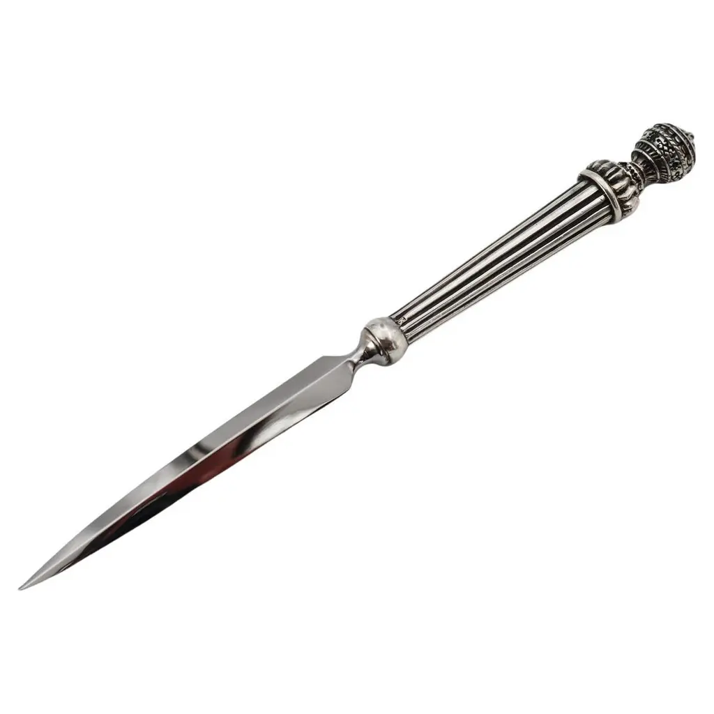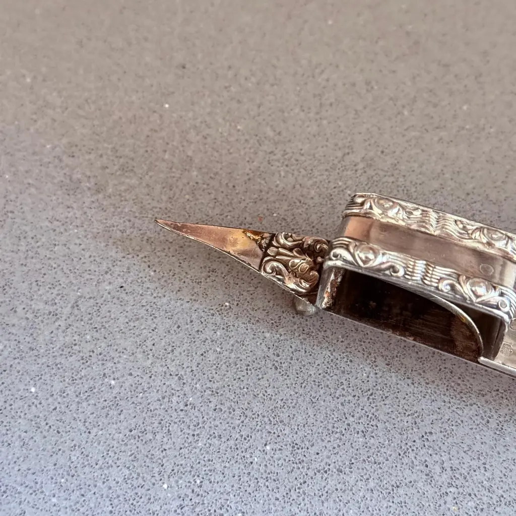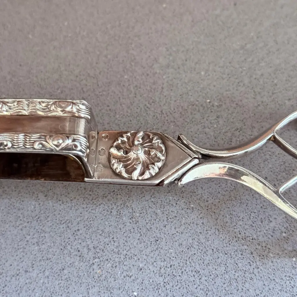 Antique Silver-Plated Candle Wick Trimmer Scissors, Victorian Table DecorAn exquisite antique silver-plated candle wick trimmer, showcasing elegant Victorian craftsmanship and timeless beauty. This rare scissor-style trimmer features intricate repoussé floral detailing, a decorative snuffer box, and gracefully curved handles a fine example of 19th-century metal artistry.Originally designed to trim candle wicks and collect burnt residue to maintain a clean flame, this trimmer remains both functional and decorative, making it a refined addition to any antique collection, mantel display, or luxury table setting.Its polished silver finish and ornate design reflect the sophistication of the Victorian era, perfect for collectors of silver accessories, period tableware, or English domestic antiques.Details:Reference Code: SILV175Material: Silver-plated metalPeriod: Late 19th century / early 20th centuryStyle: Victorian / Rococo RevivalDimensions: [23x5x3 cm]Condition: Excellent antique condition with light age patinaOrigin: EnglandA wonderful piece for antique collectors, interior decorators, or gift buyers seeking an authentic historic accent. Display it on a silver tray, writing desk, or candlelit sideboard for a touch of timeless charm.antique silver candle wick trimmer, silver-plated wick scissors, Victorian table decor, ornate silver accessory, vintage home decor, English silver antique, collectible candle snuffer, rococo revival silver, decorative metalwork