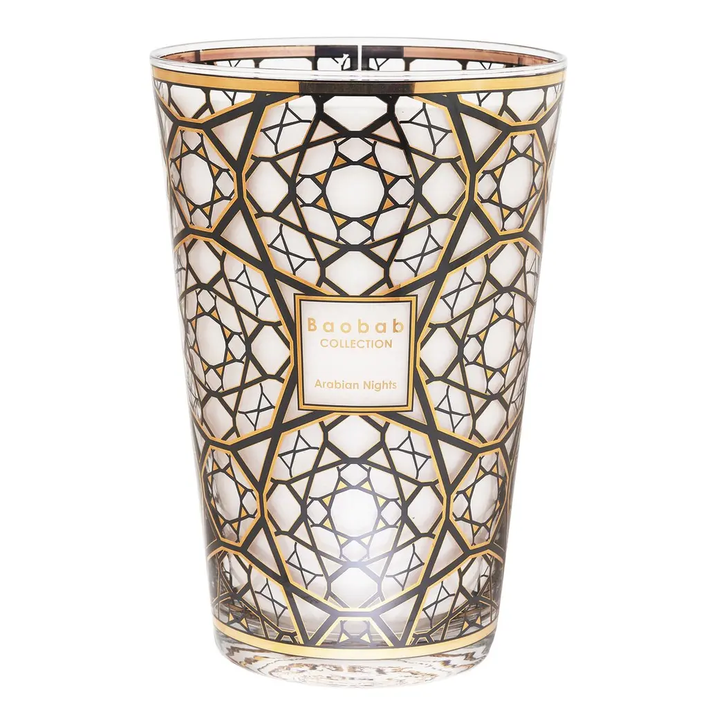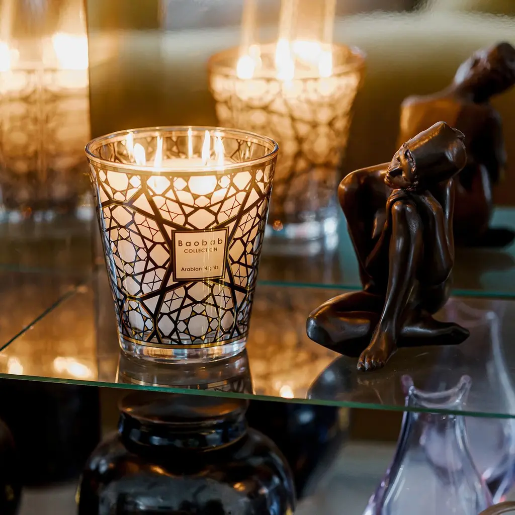 The Arabian Nights scented candle takes us to the mysterious world of the Middle East. With glass screen-printed with 9 carat gold, it draws its inspiration from the famous moucharabieh, open work motifs found in Arab architecture.