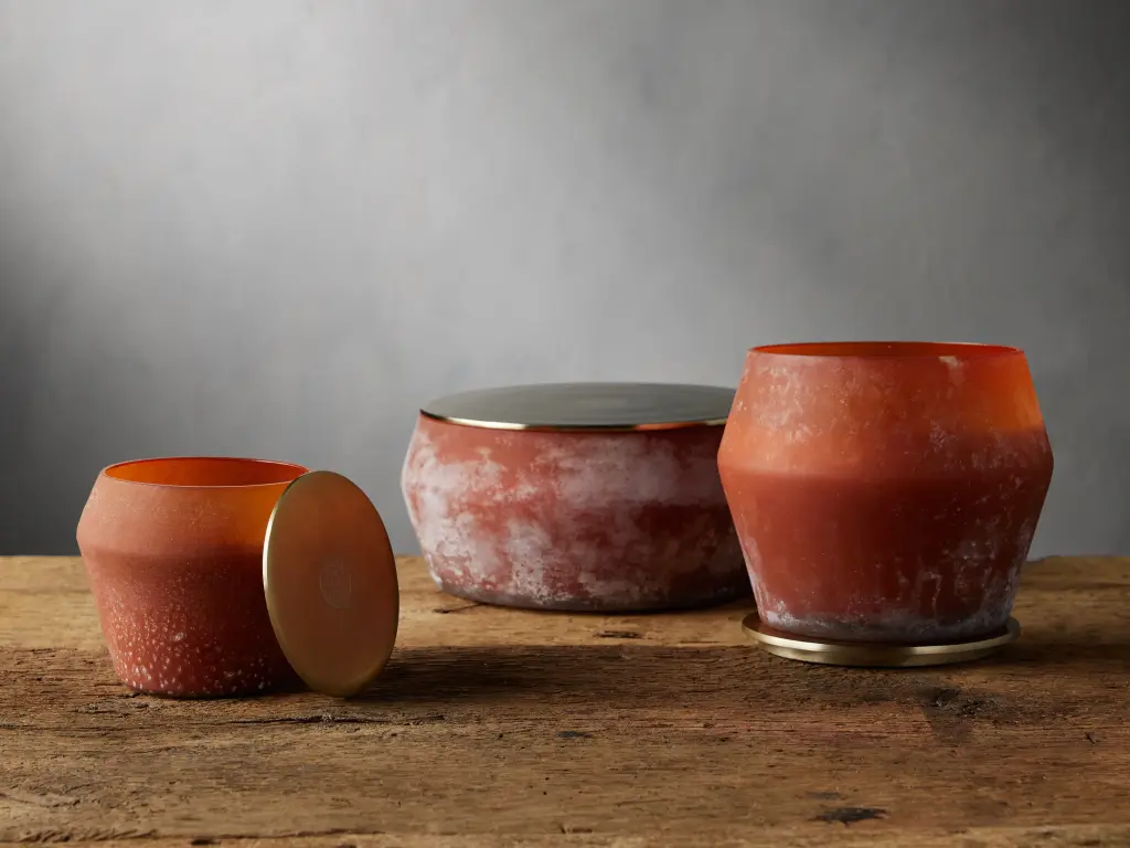 Indulge in our beautifully fragranced, artisanal Arhaus Elements Candles. Each candle features a reusable hand-blown frosted glass container with cast aluminum lid in a stunning brass finish. Evoke the spirit of nature in our complex layered fragrances of rustic pinewood, white cedar, and crushed sage gathered with forest moss, warm earth, spiced pumpkin, and painted leaves.