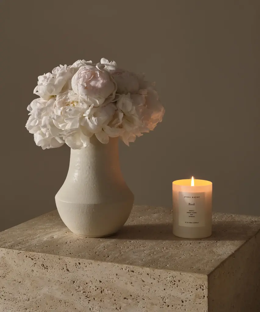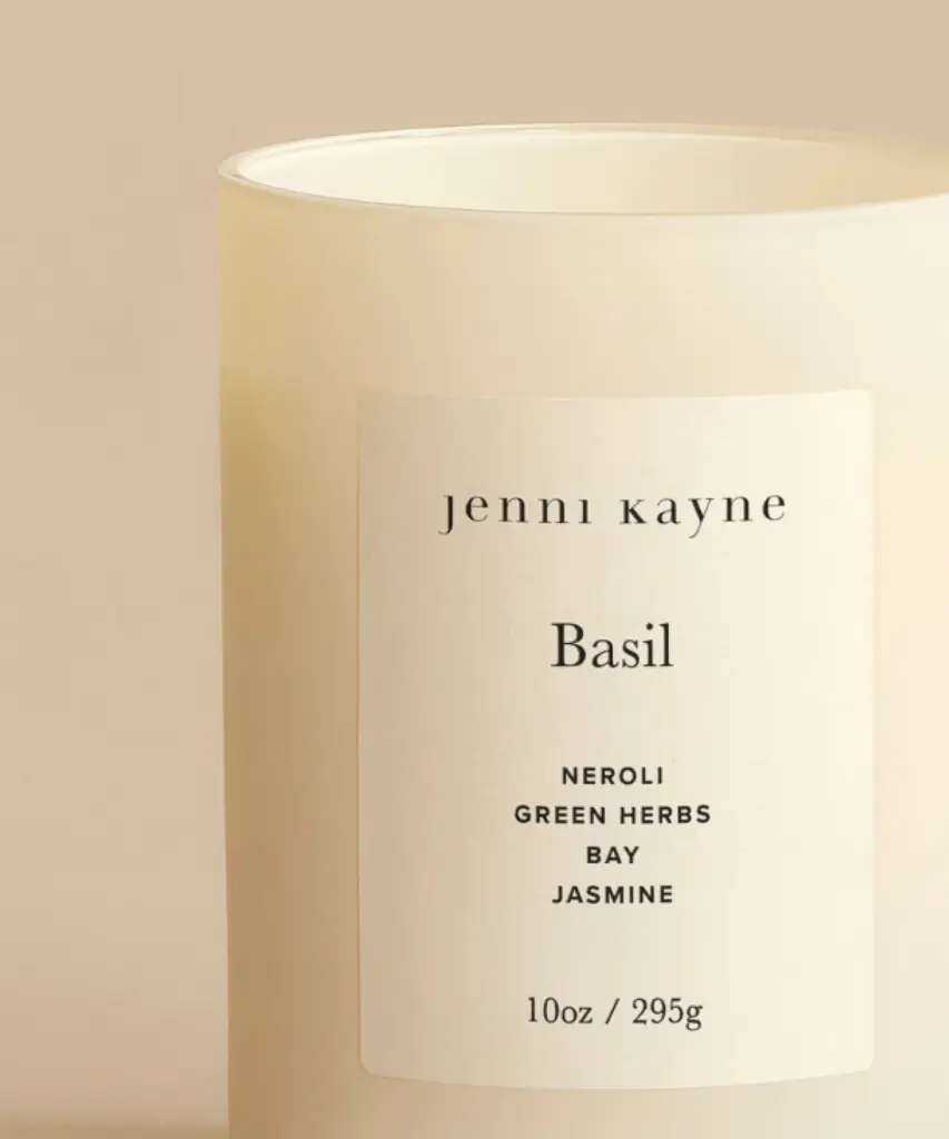 Basil Glass Candle One of Oprah’s Favorite Things 2019! Bright and fragrant, this candle creates an energetic atmosphere, perfect for the kitchen or bathroom, with notes of neroli, green herbs, bay leaves, and jasmine. Vessel and scent developed and hand-poured in Los Angeles. Wax is a natural blend of coconut, soy, apricot oil, and paraffin with a lead-free cotton wick. Burn Time: 50-70 hours. To repurpose your glass candle vessel, simply remove the wick by adding a drop of boiling water, wait a few minutes and remove with pliers.