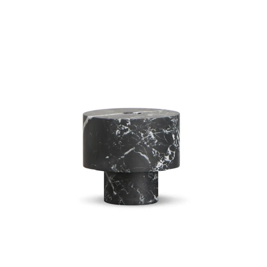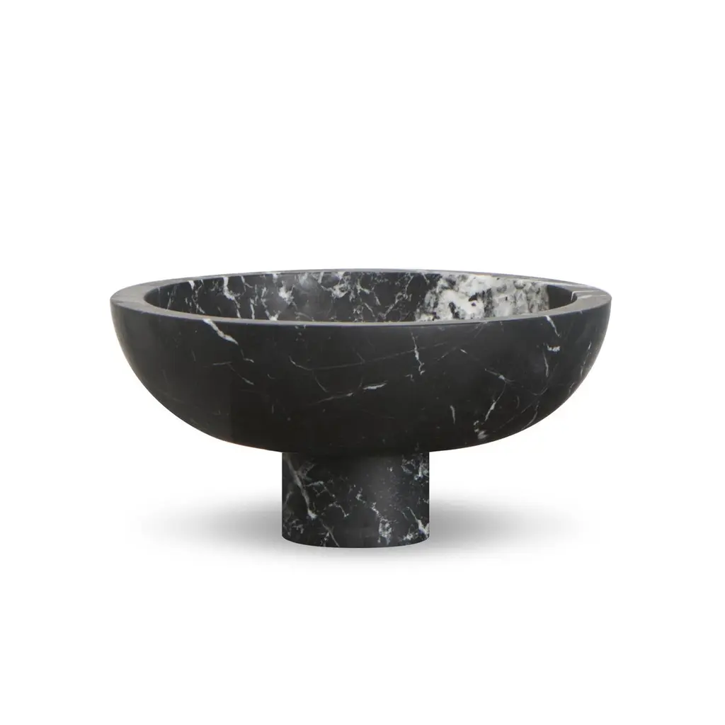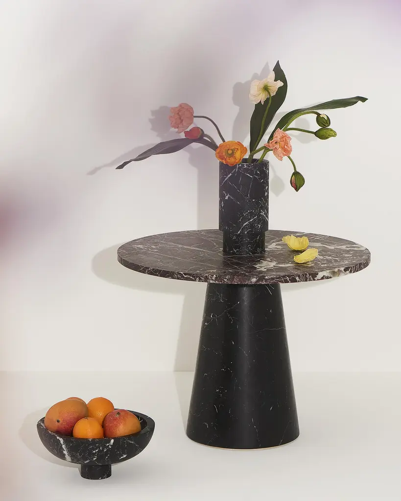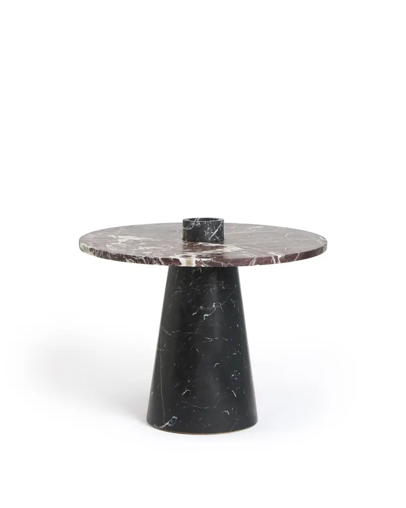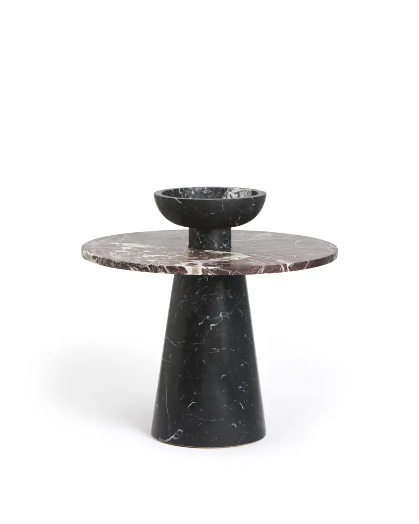 Black inside out coffee table set by Karen ChekerdjianDimensions: 58 x 32 x 70 cmMaterials: Rosso Levanto, Nero MarquiniaIncludes: Coffee table with fruit bowl, candle holder, flower vase in red marbleKaren’s trajectory into designing was unsystematic, comprised of a combination of practical experience in various creative fields and endeavours.After an experience at Leo Burnett Beirut (1991), she moved to Milan in 1997 to pursue a master’s degree in Industrial Design at Domus academy, under the guidance of Massimo Morozzi, a founder of Archizoom. She continued to work with Morozzi at Edra for four years before establishing her own brand.Her creations have been showed in several museums, foundations, galleries and international fairs. Her famous “TOTEM” is part of the permanent collection of the Musée des Arts Décoratifs in Paris.