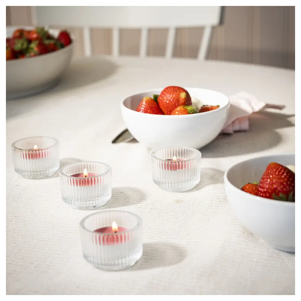 BLODBOK Scented tealight - Strawberry/bright pink 3.5 hr. A summery scent of sun-warmed strawberries with distinct hints of sweet vanilla ice cream. Suitable when you want to create a playful and familiar atmosphere at home with inspiration from long, lazy summer days. Do not burn in a drought.