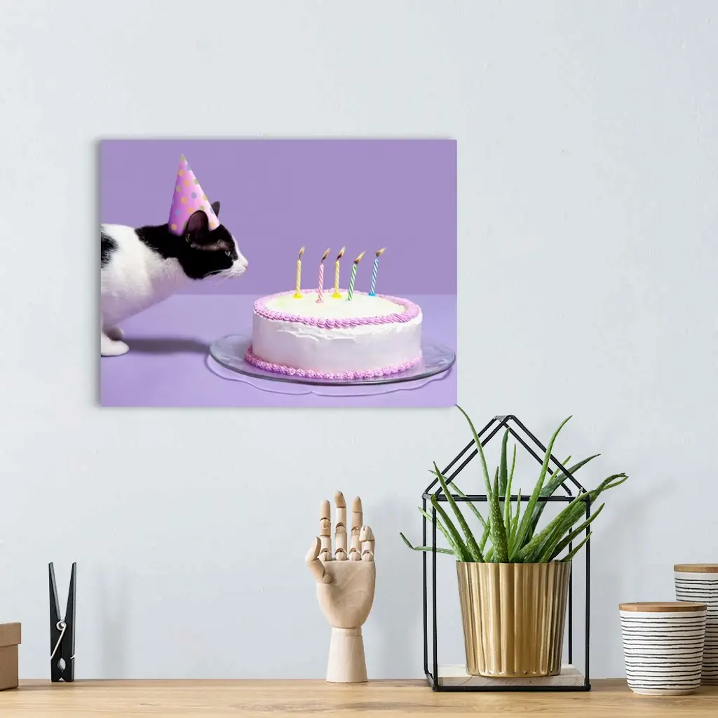 Cat wearing birthday hat blowing out candles on birthday cake wall art for home and office decor. Discover canvas art prints, photos, mural, big canvas art and framed wall art in GreatBigCanvas.com's varied collections.