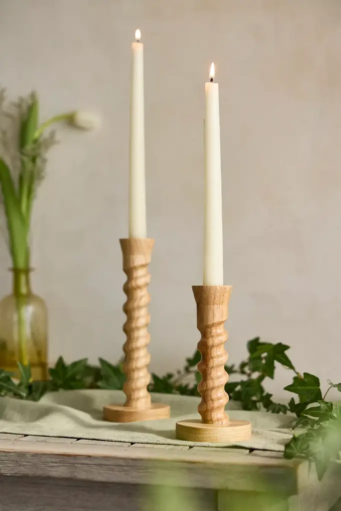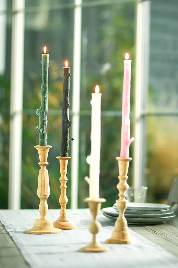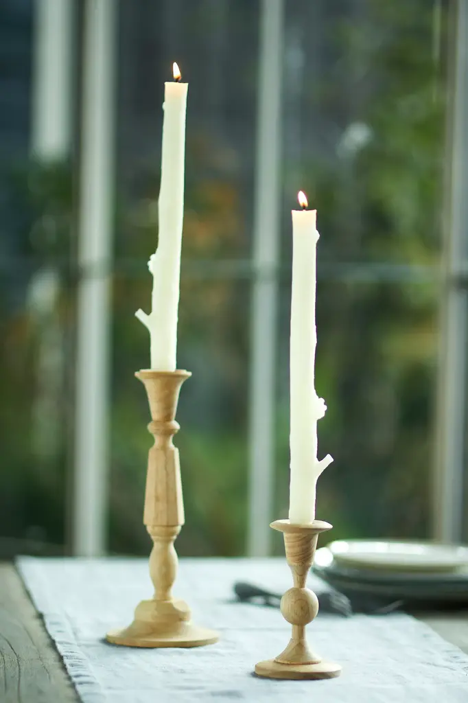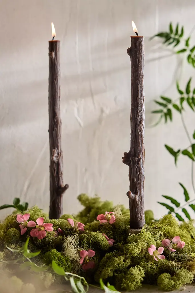 Beeswax tapers take the shape of branches, twigs, and sticks, each one cast directly from nature for an organic, earthy look. Arrives in a set of two. Note: Original appearance, color and shine can be restored with a heat gun, hair dryer, or by passing candles under hot tap water.