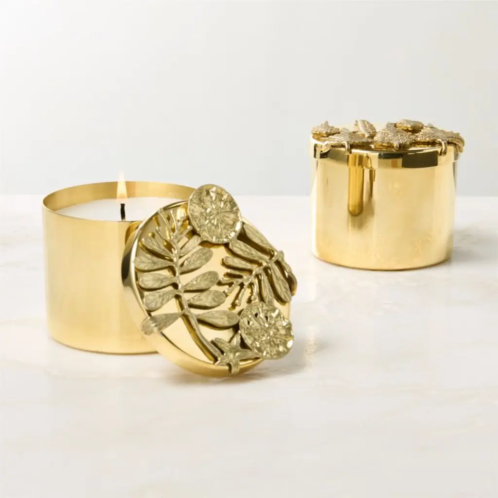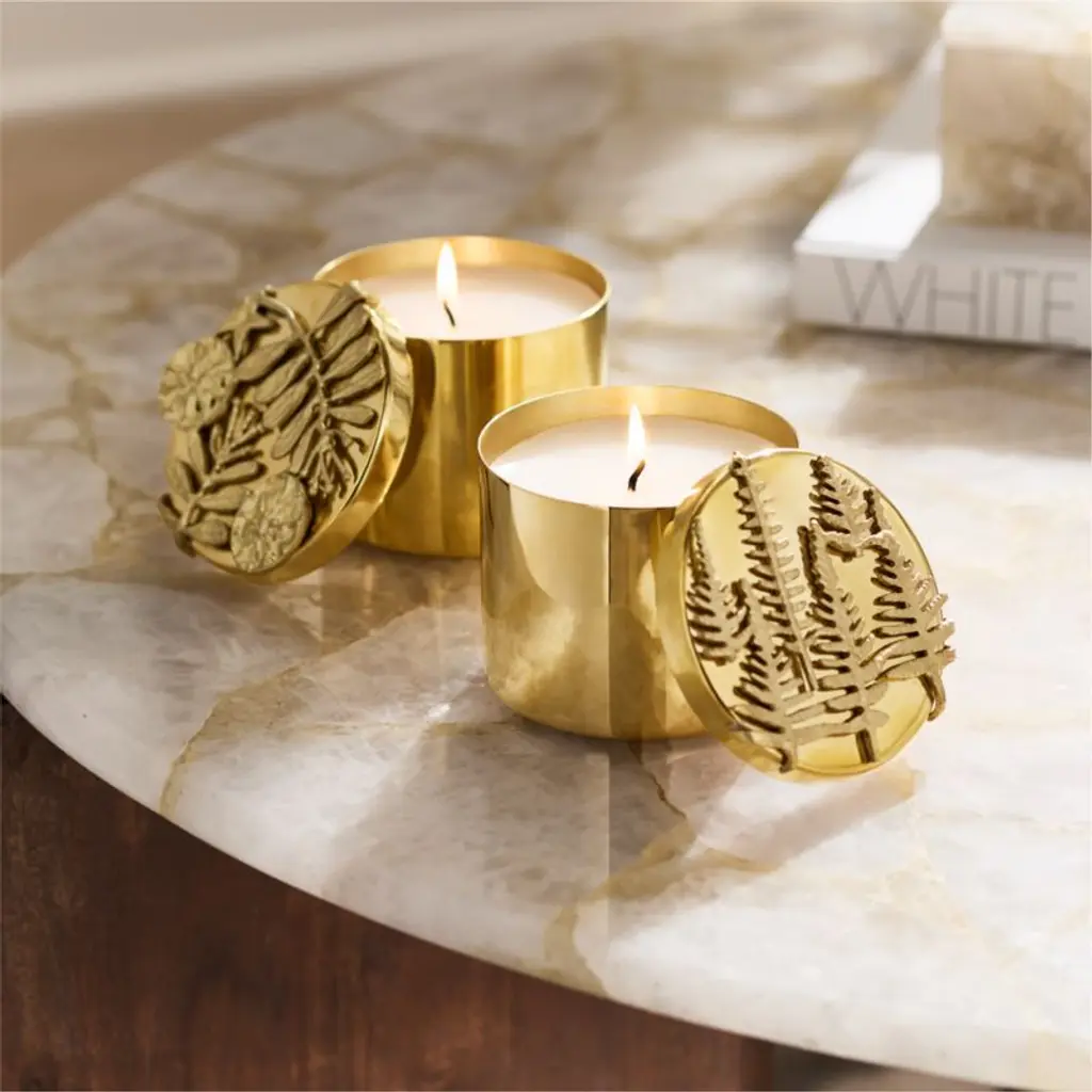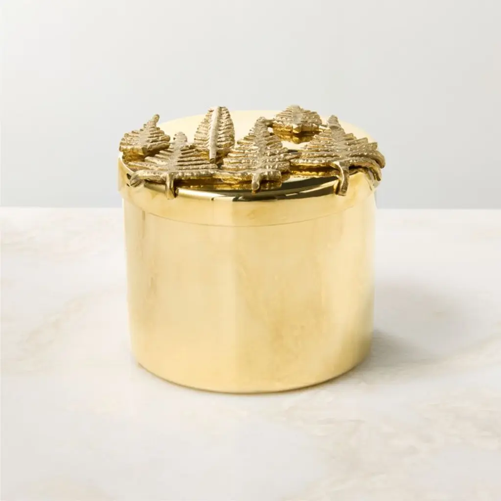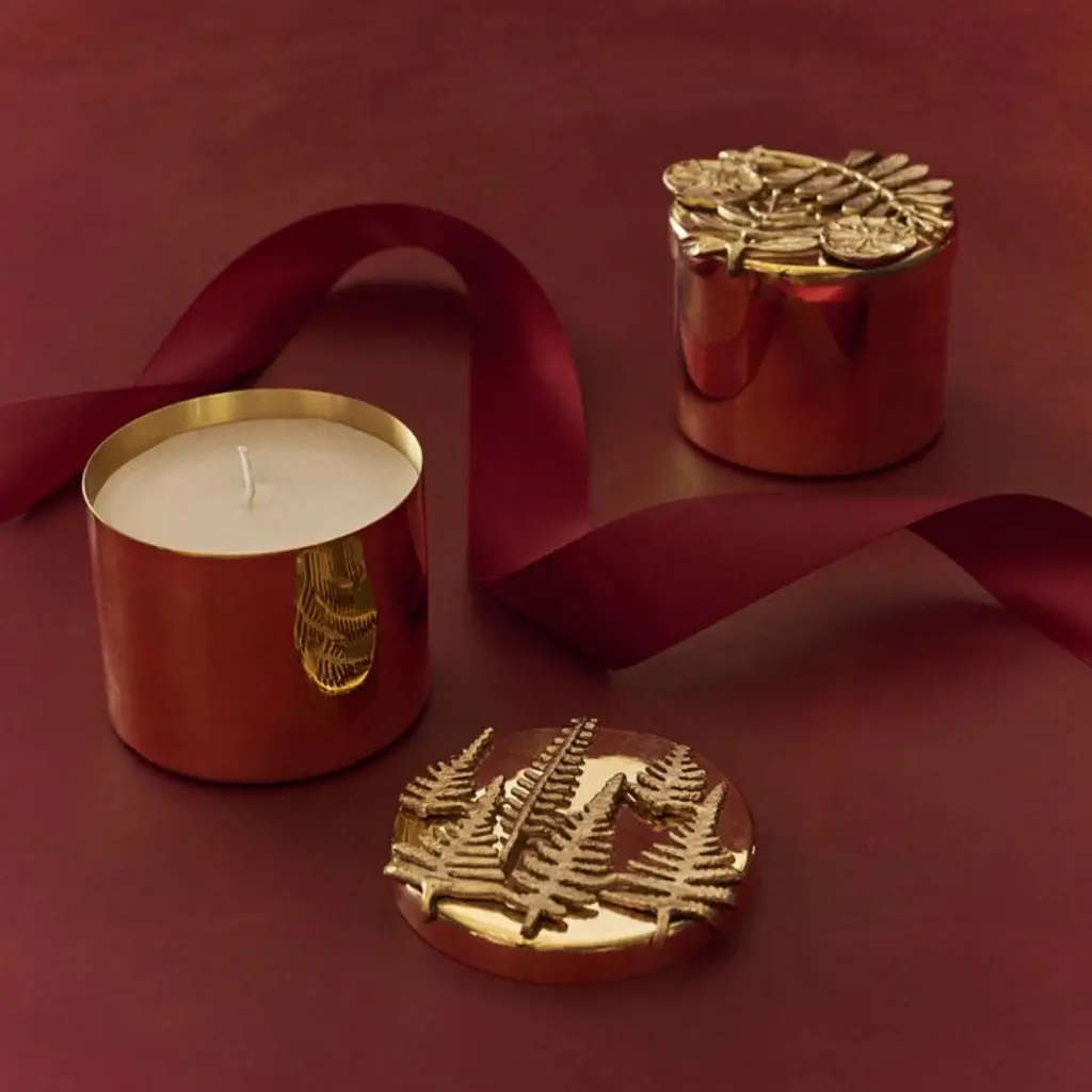 Texas cedarwood and tobacco are softened with notes of ginger rose, jasmine, oakmoss, musk and pine in this woodsy scented candle. A perfect gift for the holidays, the reusable vessel features a handcrafted cast brass design on the lid representing the candle's serene scent. The brass is unlacquered, offering a living finish that will develop the patina of a vintage find. Simply polish the brass to bring back its original luster. Scent designed by Joya, a chic fragrance studio based in a 19th-century Brooklyn rigging garage. CB2 exclusive.