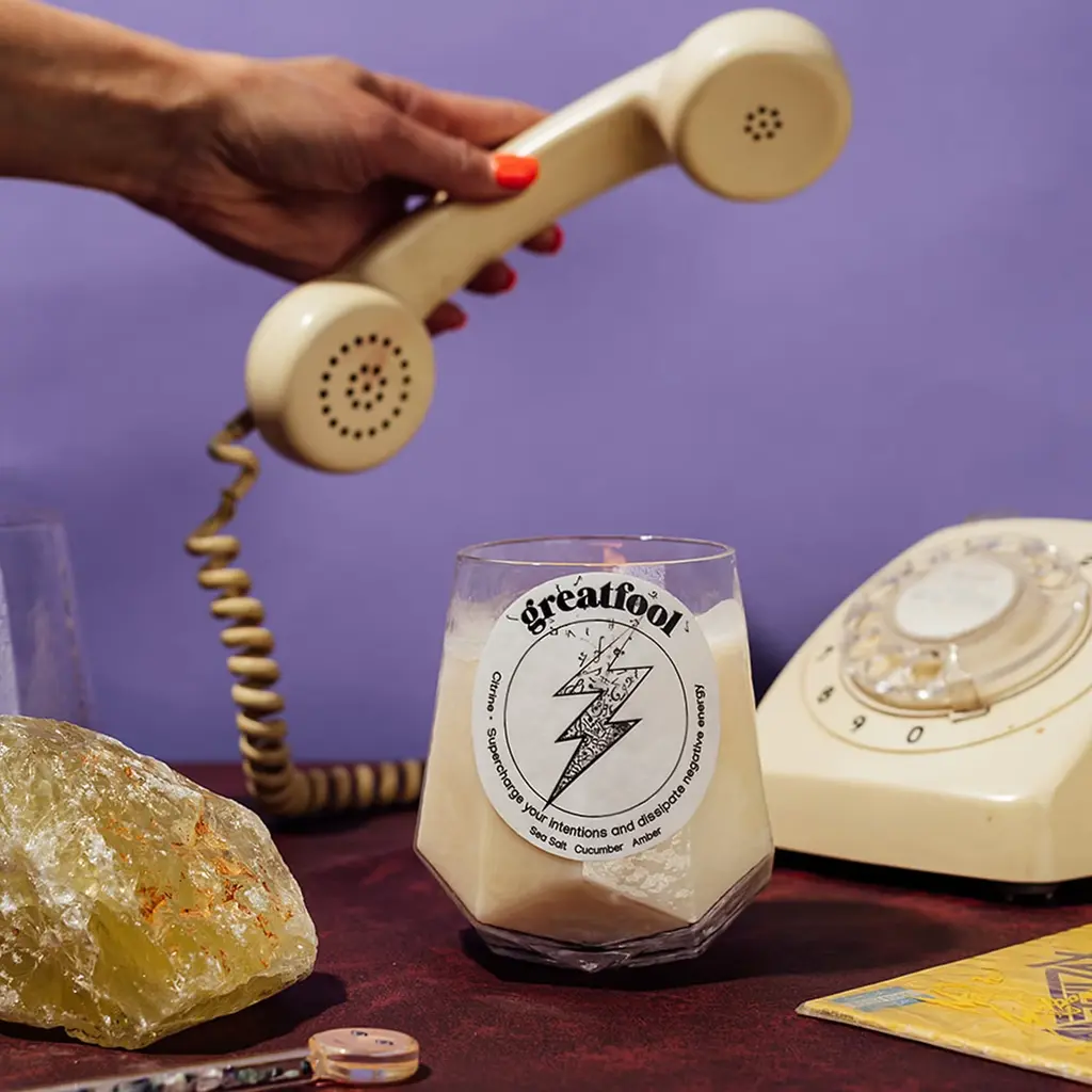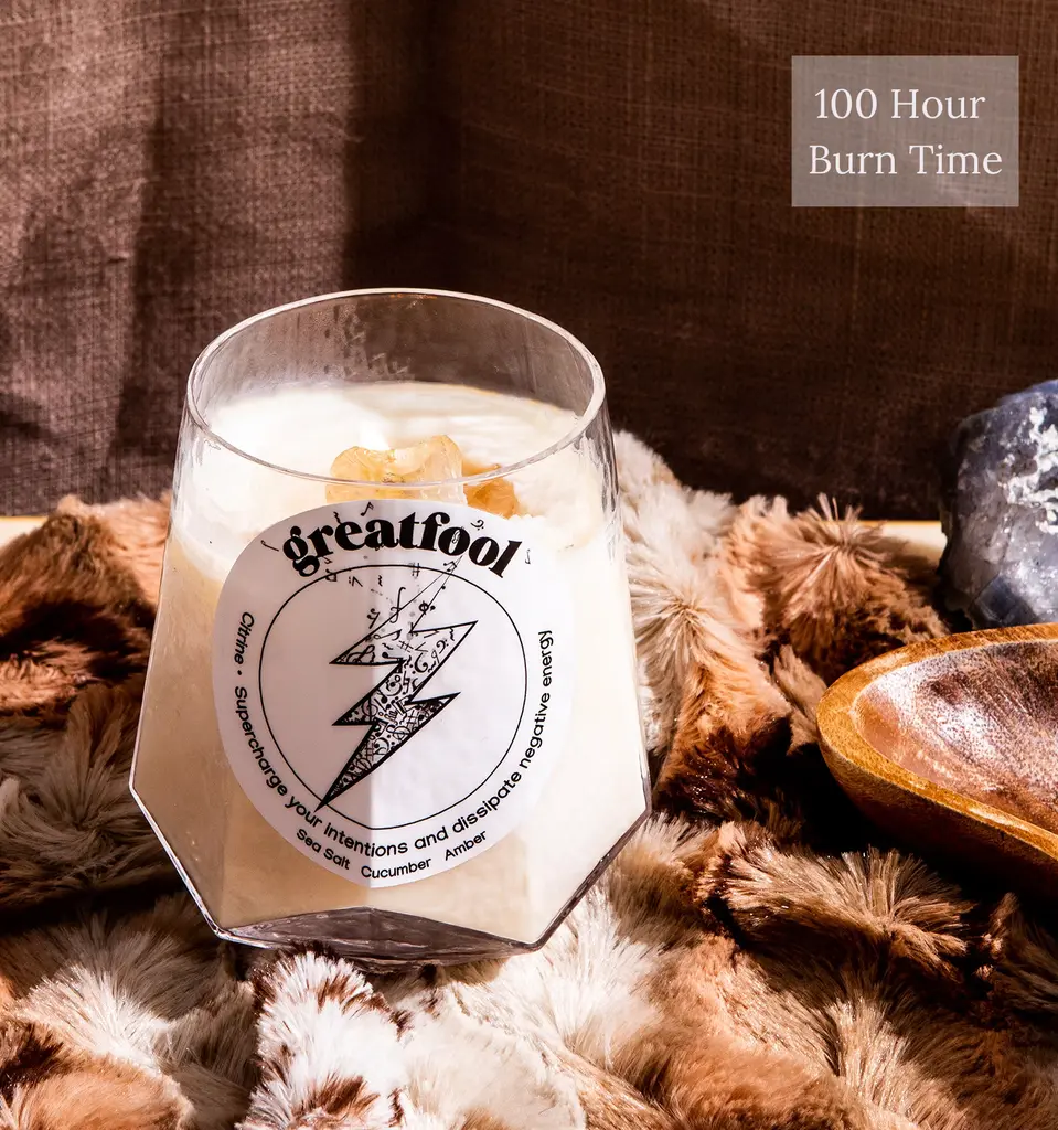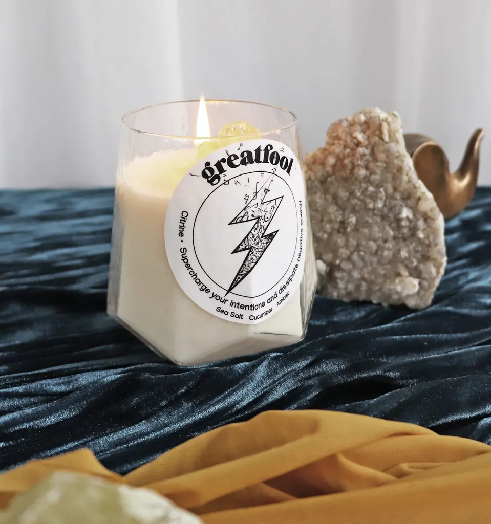 Awaken your creative energies and manifest all that you desire with this unique crystal candle to attract joy, wonder, prosperity and success— whatever your intentions. The queen of crystals and warmed by the sun, citrine can also boost your self-esteem, making this your go-to candle when you need an extra push to handle all that comes your way. Sea salt, cucumber and amber combine to make for a harmoniously fresh and uplifting scent, complementing the detoxifying properties of added citrine crystals.