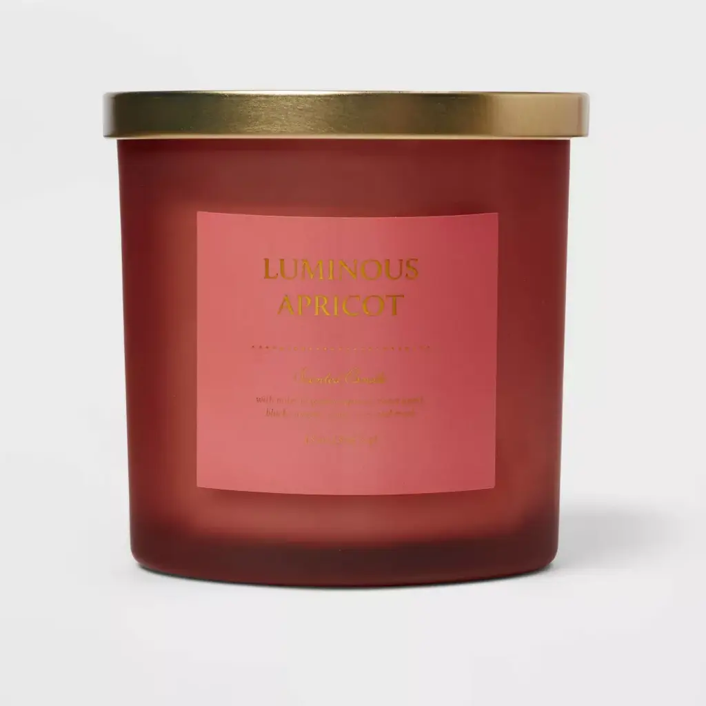 Transform your space into a calming retreat with Colored Glass Candle Luminous Apricot Pink by Threshold™. The beautiful pink frosted glass jar with a charming gold lid, is all set to create an upscale atmosphere. Delicately scented with a blend of fruity, floral and woodsy notes, this lovely apricot candle will soothe your senses and bring calmness to any area you put it in. With 25 hours of burn time, the luminous apricot candle by Threshold™ will help create a relaxing oasis like no other. Casual classics for house and home.