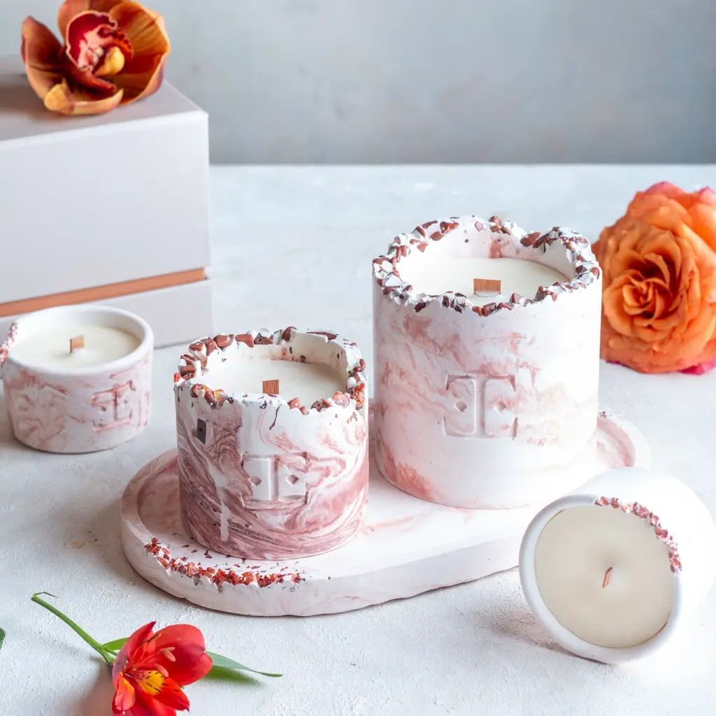 Each candle is meticulously handcrafted, infused with rich copper tones and mesmerizing aromas to create an inviting ambiance. The warm glow enhances the captivating blend of jasmine and musk, while fig and floral notes gently envelop you in tranquility. As the candle burns, delicate hints of iris and vanilla emerge, adding a touch of sophistication.Immerse yourself in the elegance and magic of Copper Charm, and let its radiant hues and enchanting scent transform your space.