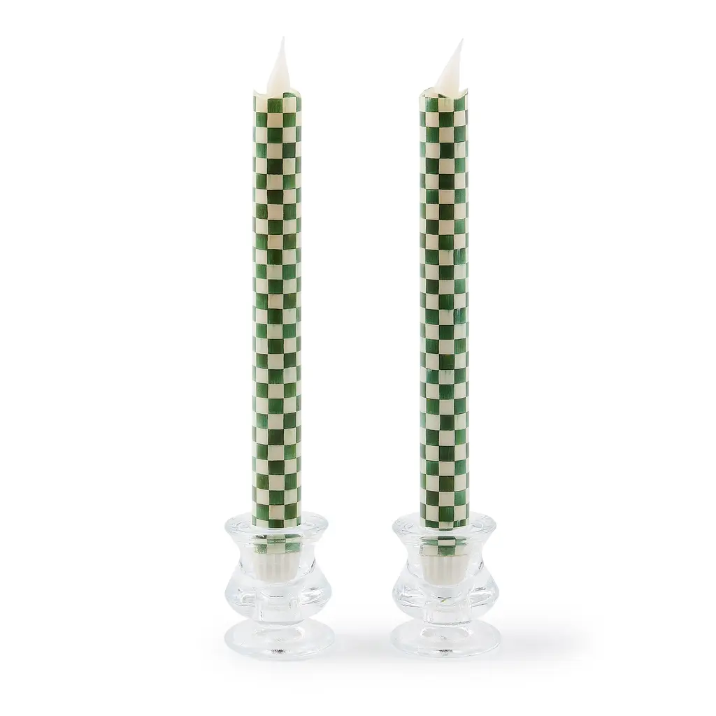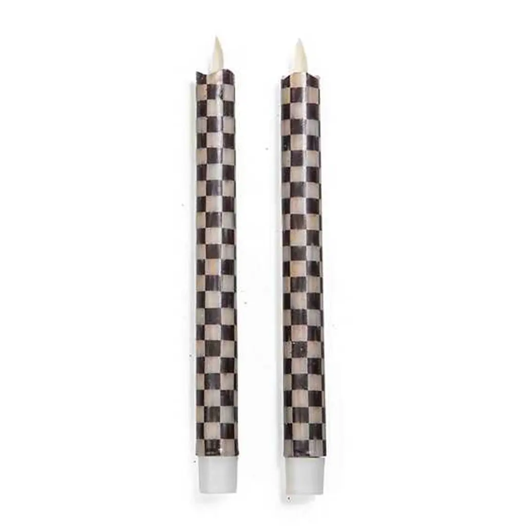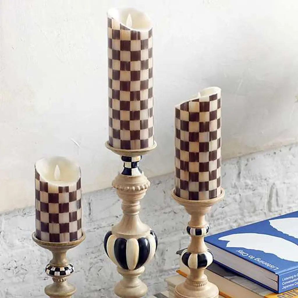 Every celebration can glow with MacKenzie-Childs style with our 7" Courtly Check® Flicker Pillar. This everlasting light, decorated with our signature Courtly Check, has the look of a wax candle but glows with flickering light created with two AA batteries. The light can be set on a five-hour timer with an included remote control. Pair it with our 5" and 9" Courtly Check Flicker Pillars.