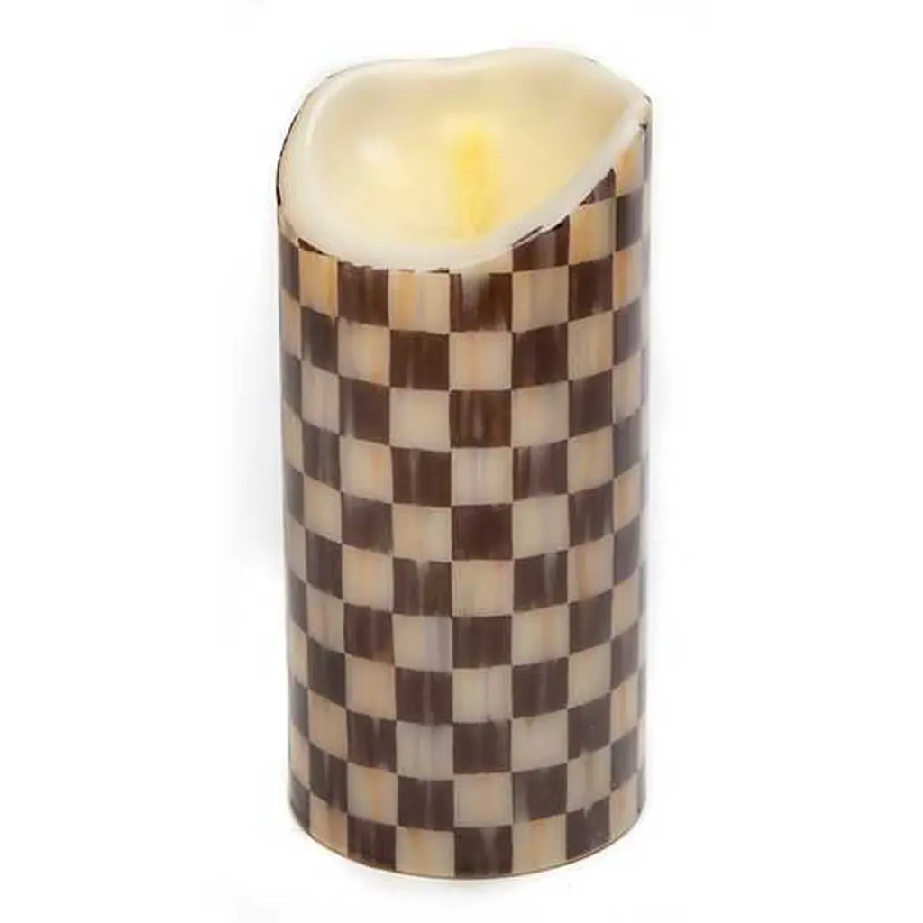 Every celebration can glow with MacKenzie-Childs style with our 8" Courtly Check® Flicker Pillar. This everlasting light, decorated with our signature Courtly Check, has the look of a wax candle but glows with flickering light created with two AA batteries. The light can be set on a five-hour timer with an included remote control. Pair it with our 6" and 10" Courtly Check Flicker Pillars.