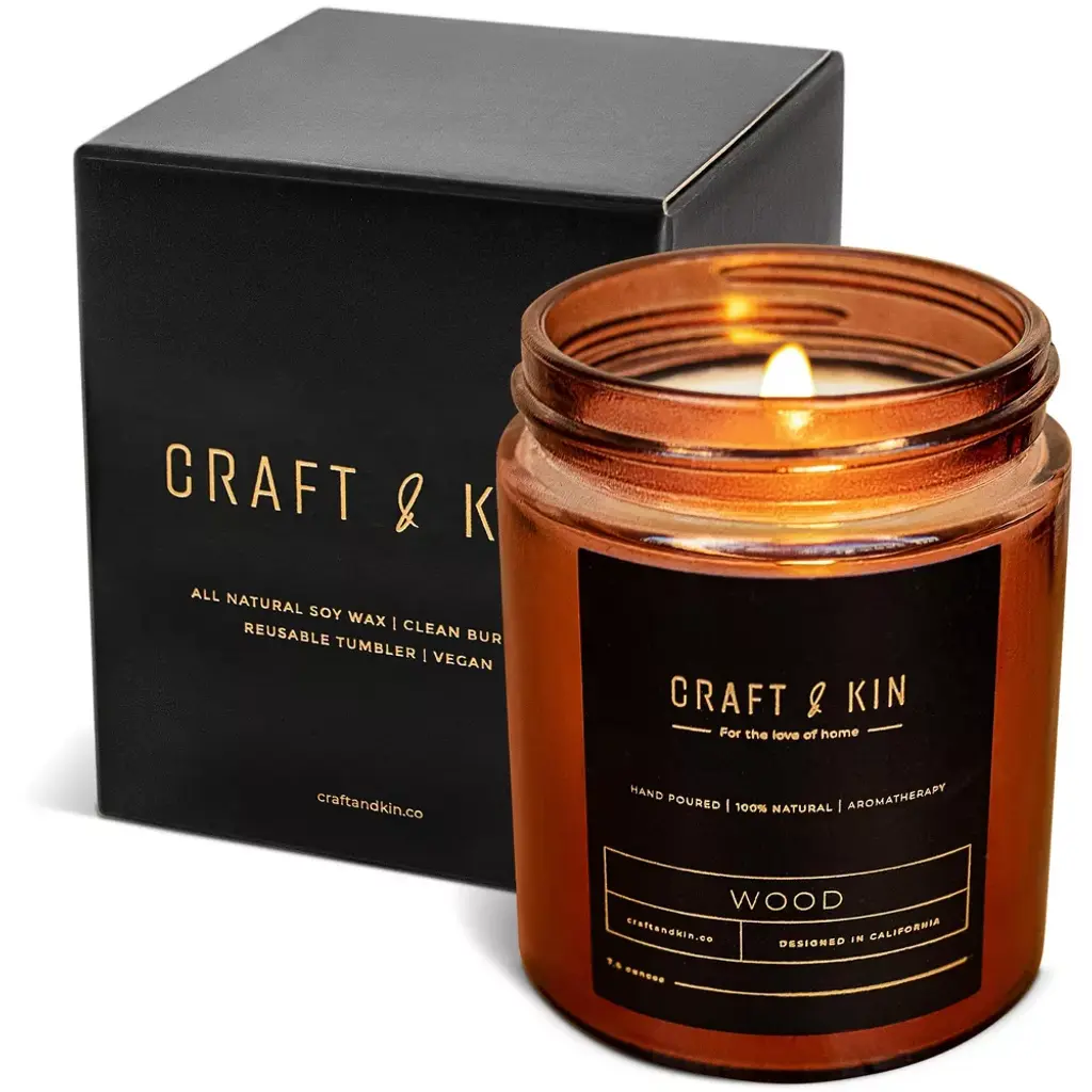 Craft & Kin Wood Wick, All-Natural Soy Aromatherapy Candle in Amber Glass Jar