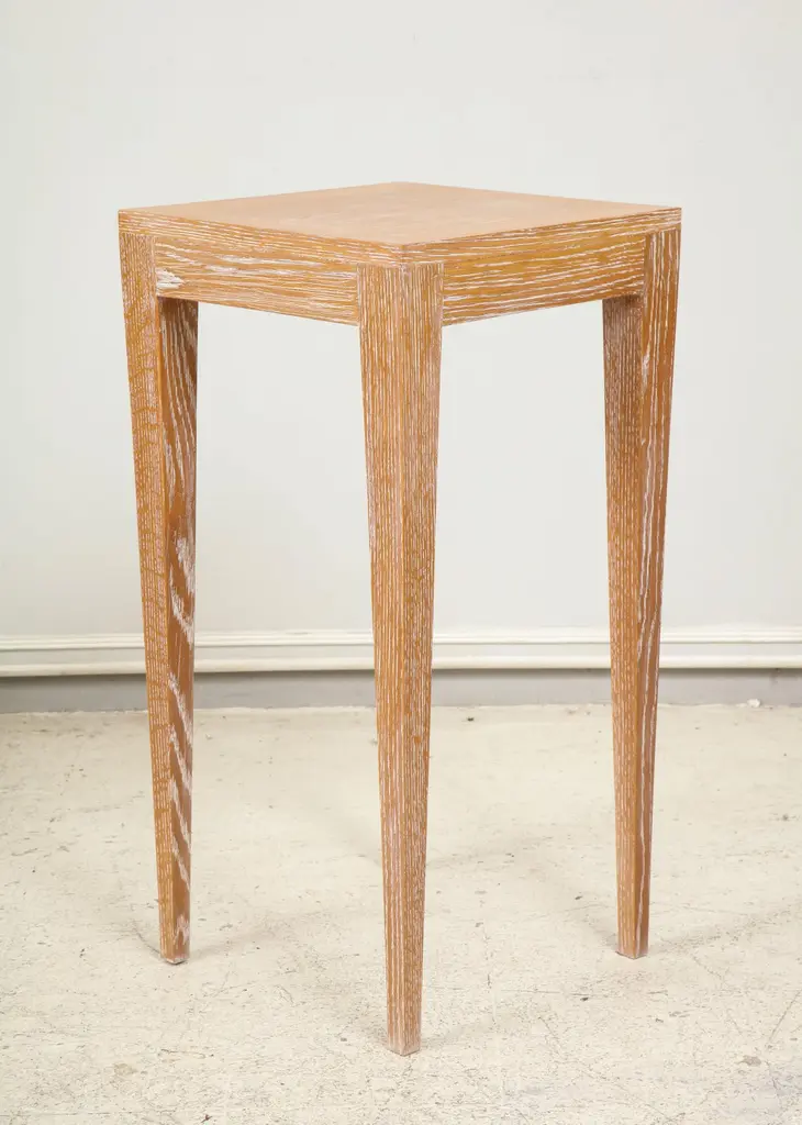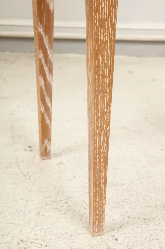 Custom cerused oak table on tapered legs.