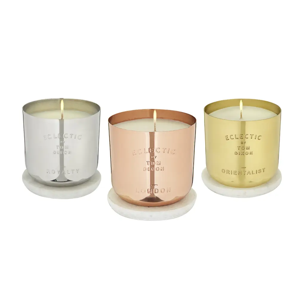 Immerse yourself into the bouquet of fragrances of a far eastern flower market with the Orientalist Candle Medium. Made by Tom Dixon, this candle showcases the Scent Eclectic concept of evoking certain places through the power of perfume. The Orientalist scent brings an Indian wedding and a Chinese herbal market to mind. The floral scent boasts cassis, violet leaves, magnolia, rose, geranium, cinnamon, clove, patchouli, musk, and amber notes. Poured into a re-usable brass-spun container, the Orientalist Candle also comes with a Morwad marble lid. This medium candle has a burning time of 50 hours. A large candle with the same scent is also available, along with other products from the Scent Eclectic line.