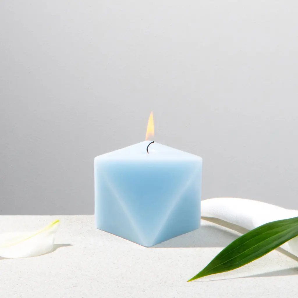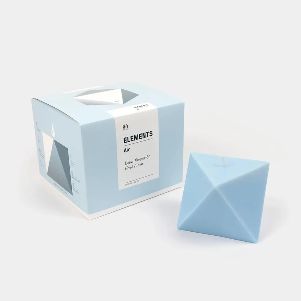 Long before the discovery of atoms, the ancient Greek philosopher Plato theorized that the world was composed of four elements: Earth, Air, Fire, and Water. He associated these elements with four geometric shapes, now known as the Platonic Solids, which he proposed were the foundational structures of the physical world. Drawing inspiration from this fascinating intersection of nature and geometry, Thorunn Arnadottir has designed our new Elements collection. Each candle in the collection is carefully infused with a unique scent and color that embody the essence and energy of one of these elemental forces, reflecting both their poetic beauty and transformative power. The Air candle from 54 Celsius Elements collection uplifts and refreshes the senses with its romantic blend of scents. This candle features the delicate and serene aromas of lotus and lily, complemented by the clean scent of fresh linen and the sweet warmth of vanilla. It is enhanced with top notes of grapefruit and rose, adding a light, floral citrus touch that elevates the fragrance. This combination creates a buoyant and airy atmosphere, perfectly embodying the essence of the air element.
