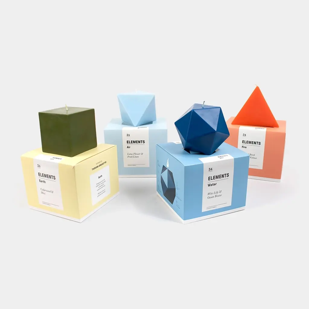 Long before the discovery of atoms, the ancient Greek philosopher Plato theorized that the world was composed of four elements: Earth, Air, Fire, and Water. He associated these elements with four geometric shapes, now known as the Platonic Solids, which he proposed were the foundational structures of the physical world. Drawing inspiration from this fascinating intersection of nature and geometry, Thorunn Arnadottir has designed our new Elements collection. Each candle in the collection is carefully infused with a unique scent and color that embody the essence and energy of one of these elemental forces, reflecting both their poetic beauty and transformative power. The Fire candle from 54 Celsius Elements collection evokes a warm and inviting ambiance with its rich fragrance of dried pine and smoked birch wood. This aromatic profile is deepened with base notes of clove and vetiver, adding a spicy and earthy dimension that enhances the overall sensory experience. This candle perfectly captures the essence of fire, bringing a cozy and comforting atmosphere to any space.