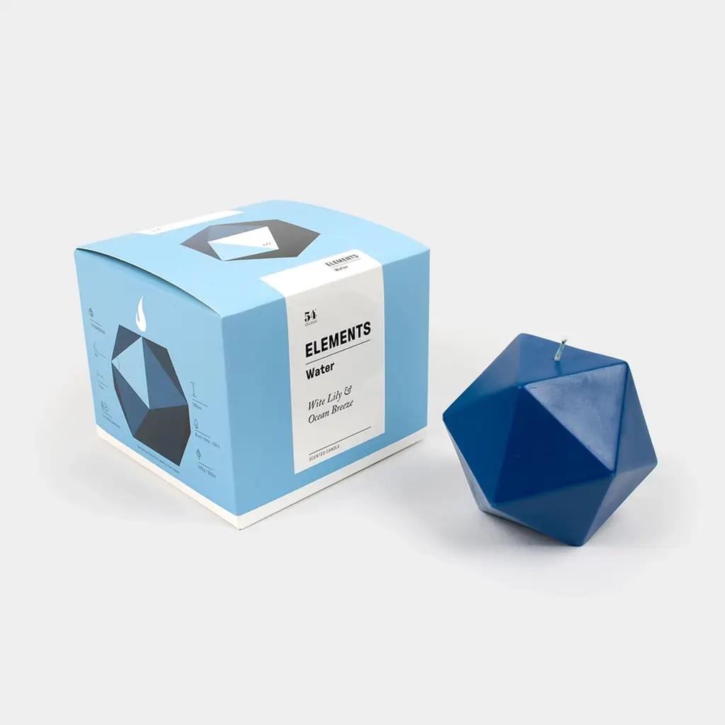 Long before the discovery of atoms, the ancient Greek philosopher Plato theorized that the world was composed of four elements: Earth, Air, Fire, and Water. He associated these elements with four geometric shapes, now known as the Platonic Solids, which he proposed were the foundational structures of the physical world. Drawing inspiration from this fascinating intersection of nature and geometry, Thorunn Arnadottir has designed our new Elements collection. Each candle in the collection is carefully infused with a unique scent and color that embody the essence and energy of one of these elemental forces, reflecting both their poetic beauty and transformative power. The Water candle from 54 Celsius Elements collection combines the sultry scent of white lily with the fresh essence of ocean breeze, creating a captivating aromatic experience. This candle is further enriched with base notes of honey, amber, and tonka, adding depth and warmth to its fragrance profile. This blend captures the serene and rejuvenating qualities of water, making it a perfect choice for creating a soothing and inviting atmosphere in any space.