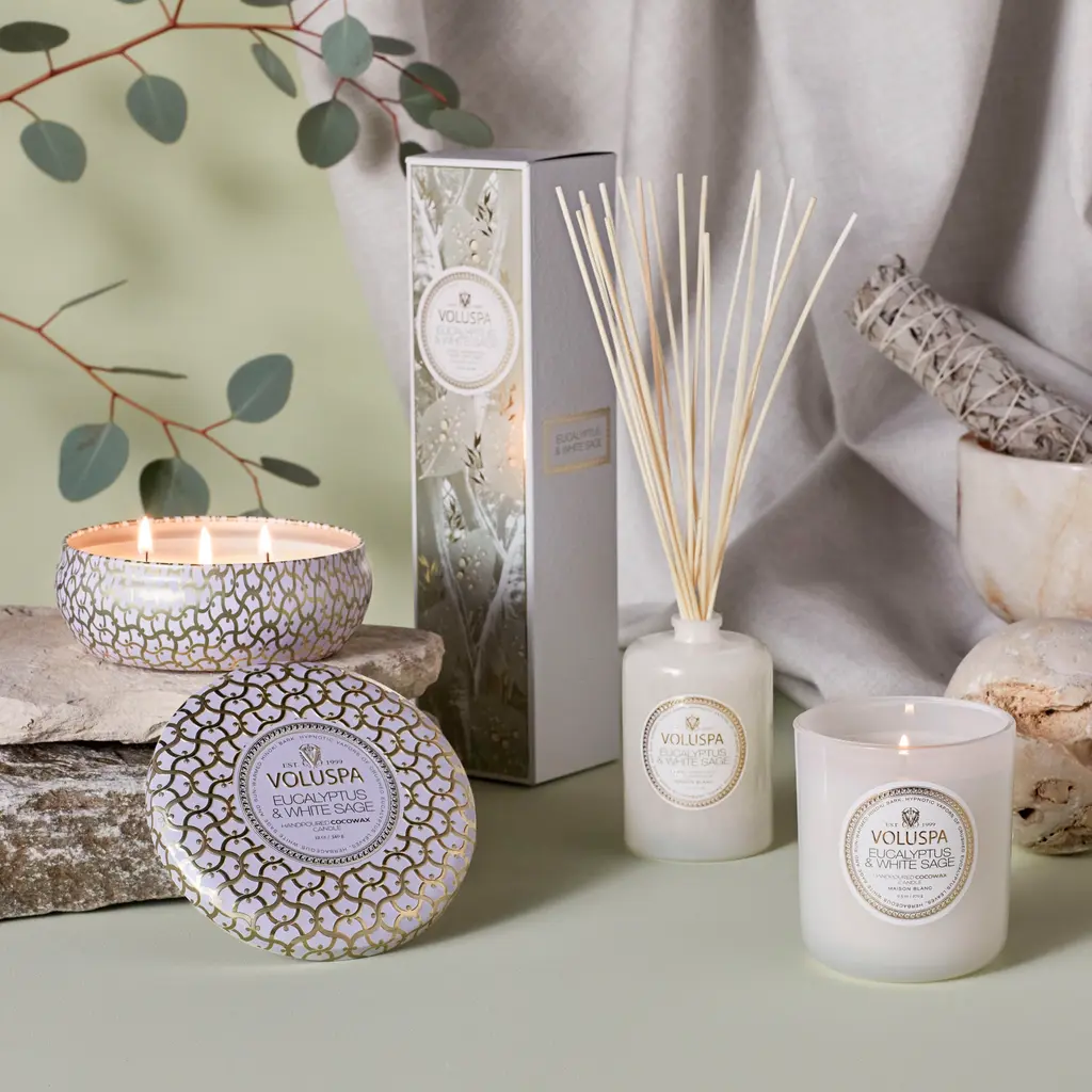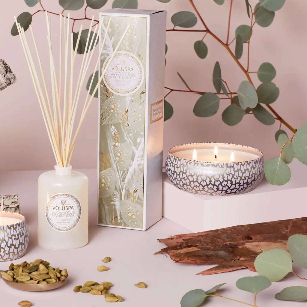 Rejuvenate your space and soul with the Voluspa Eucalyptus & White Sage Collection, featuring a hypnotic scent of crushed eucalyptus leaves, cardamom, herbaceous white sage and sun-warmed hinoki bark.