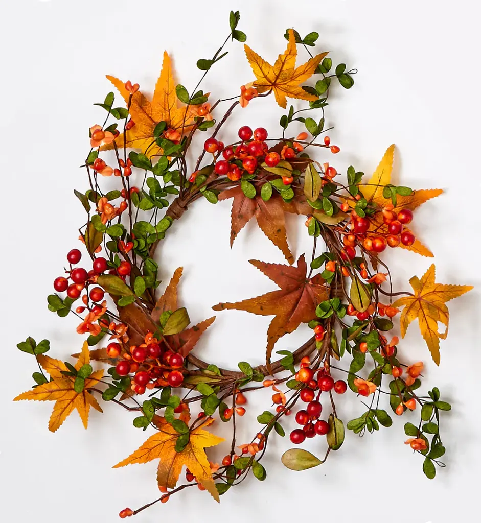 This fall berry & maple leaf wreath is the perfect sign of fall. Tthe wreath features a mix of leaves and orange berries. Fluff it to make it look wildMakes a great fall centerpieceWired to shape as you likePerfect for fall decoration