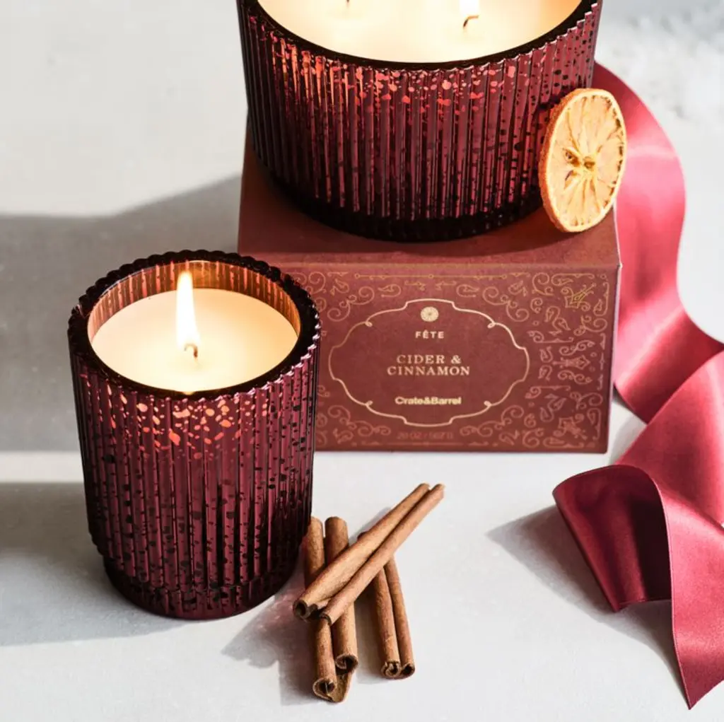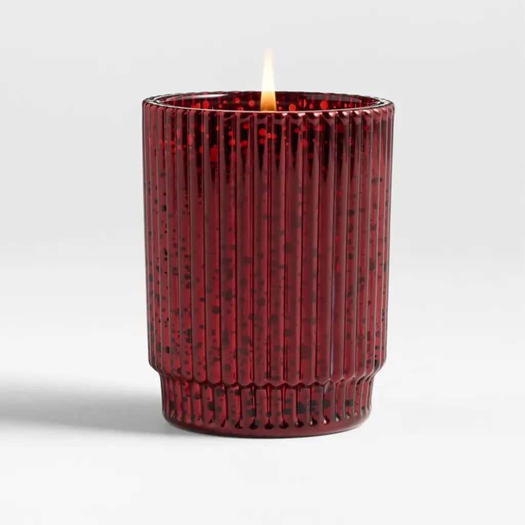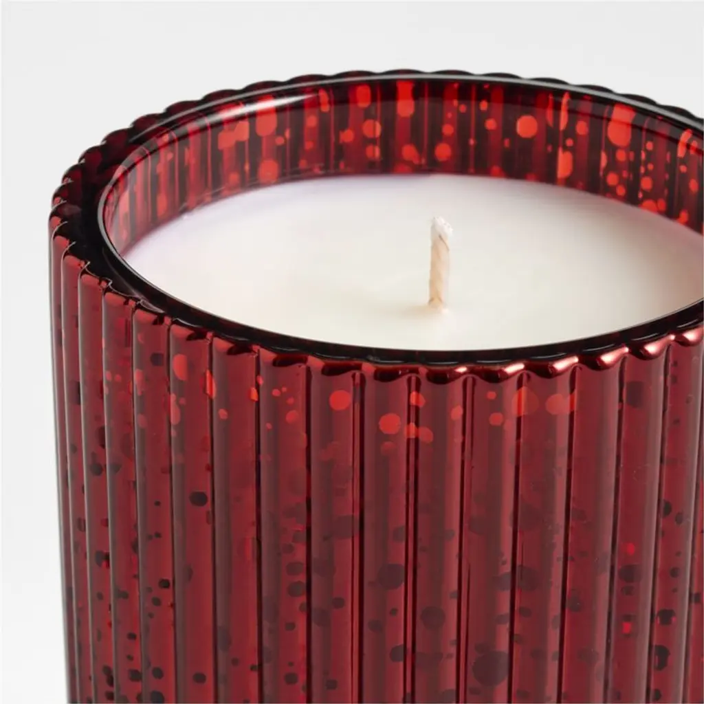 Fete the holiday season with lovely scents and dazzling candlelight. Inspired by our exclusive Atwell drinkware, the fluted candle holder takes on extra sparkle with a red mercury glass finish. The essential oil-scented candle wafts an aroma inspired by mulled wine that features essences of orange and cinnamon. Packaged in a gift box with festive, metallic-enhanced graphics, our candle makes a lovely gift.
