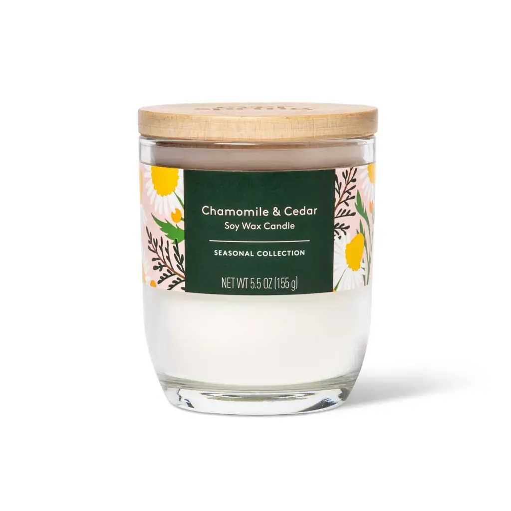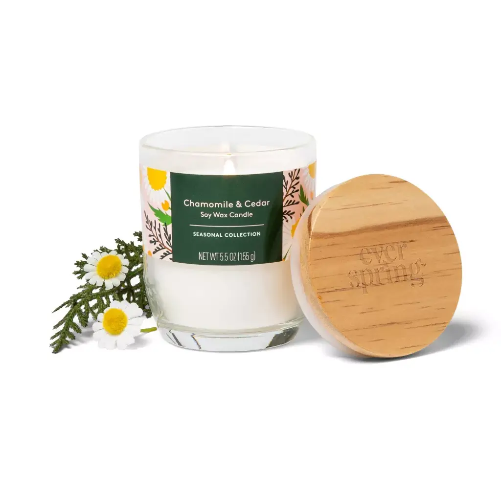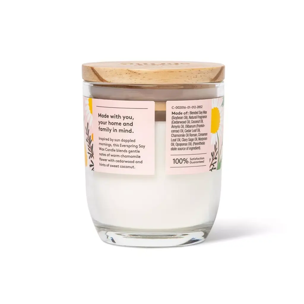 This 5.5-Ounce Chamomile & Cedar Flame Candle from Everspring™ makes it easy to create a relaxing ambiance in your home. Made from a soy wax blend, this 1-wick candle comes in a 5.5-ounce glass jar with a wooden lid. Featuring chamomile & cedarwood scents with hints of sweet coconut, the candle can be lit again and again thanks to a burn time of approximately 20 hours. Everspring™: Down-to-earth solutions that are up to Earth's standards.