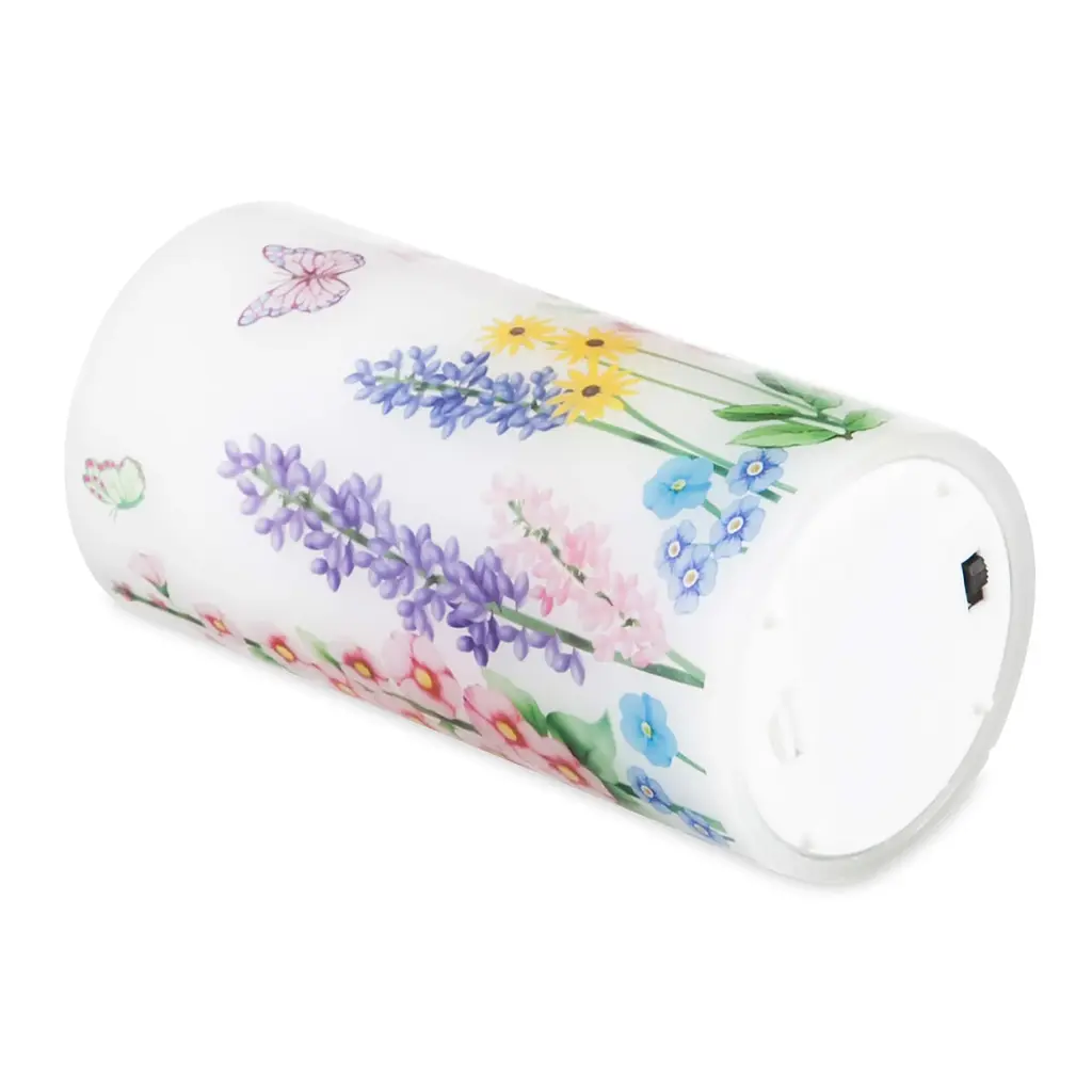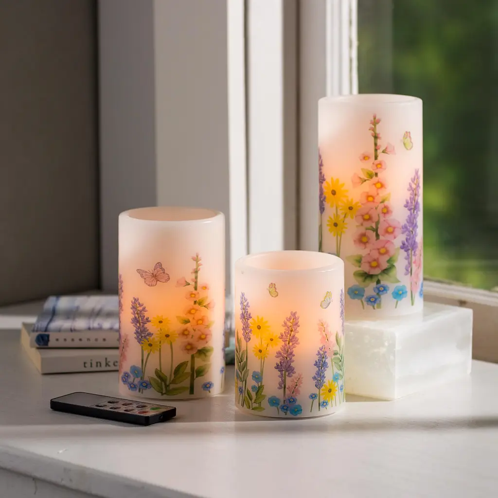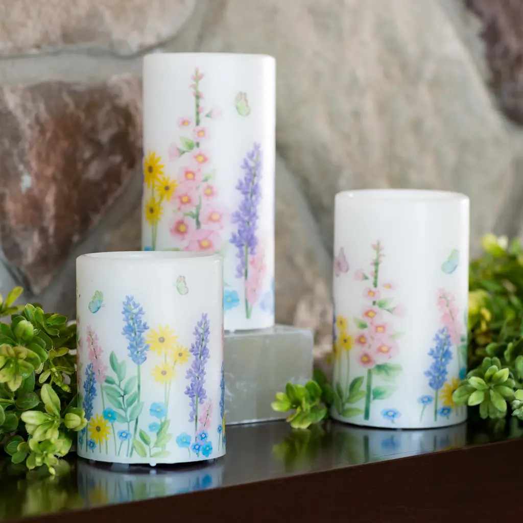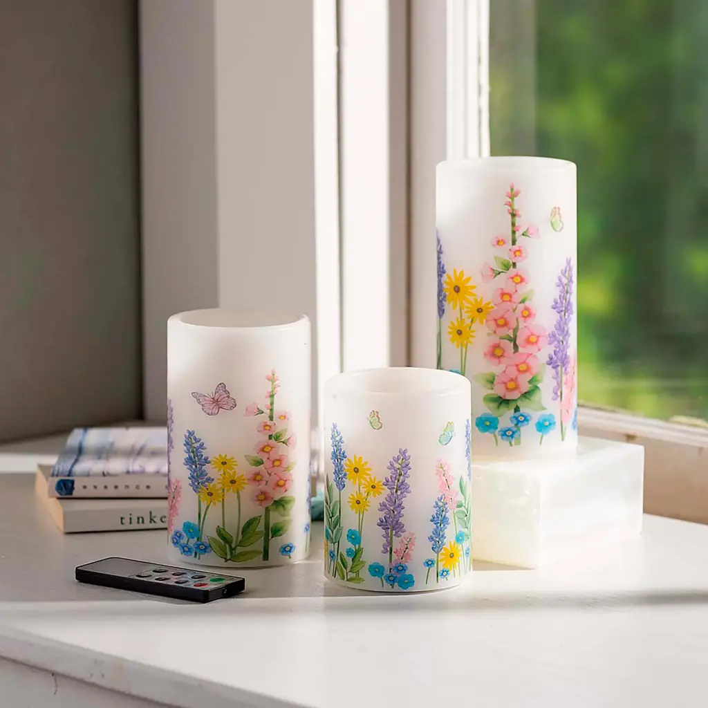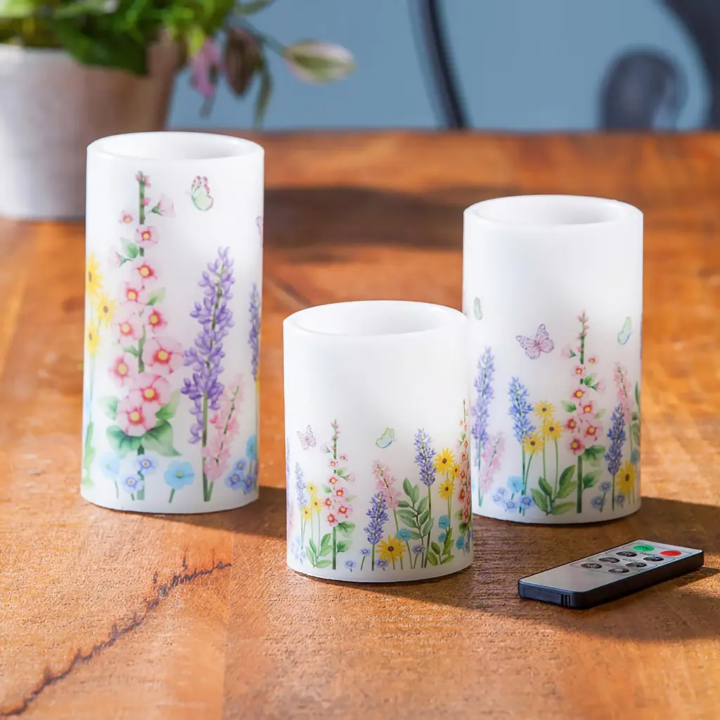 These pretty Pillar Candles add a serene mood in any room, whether they're on or off. Real wax candles have gorgeous, colorful spring flower designs that are beautiful any time of day. Battery-operated, flameless candles mean you can enjoy the look of a flickering flame without the mess, soot, smoke or fire hazard. They're beautiful in a bedroom! Graduated heights look great in a grouping, and you'll love the many lighting options offered with the included remote control: bright, dim, four and eight hour settings and more. Each takes 2 AA batteries, not included.