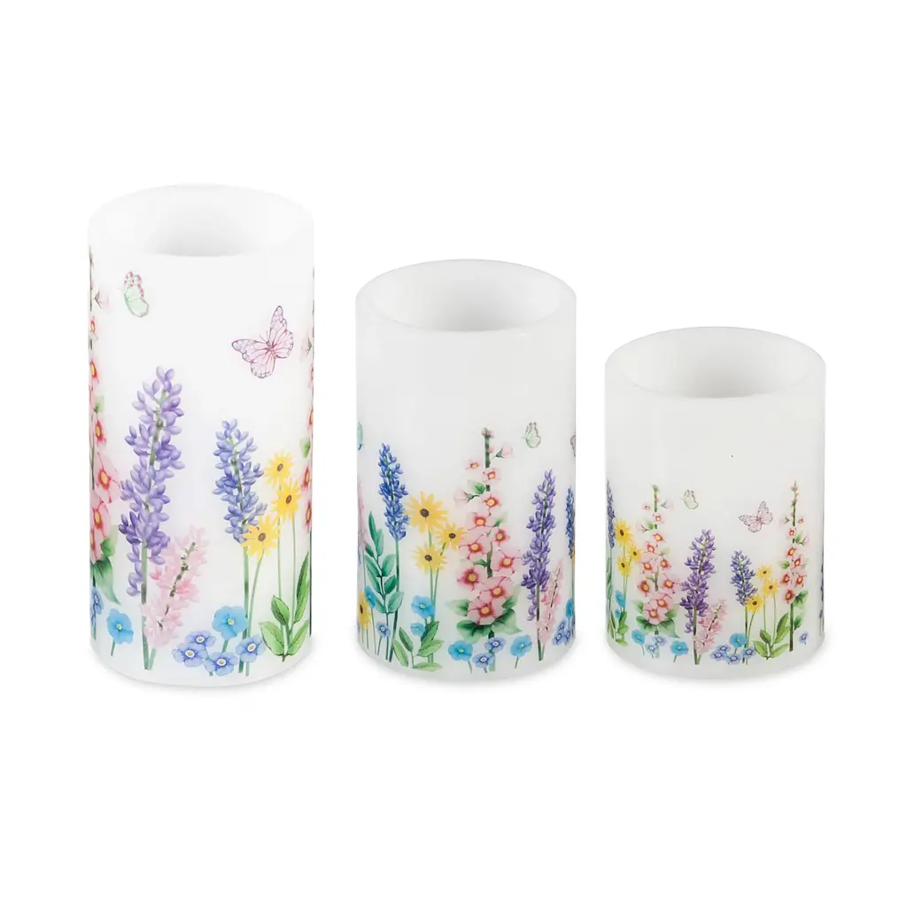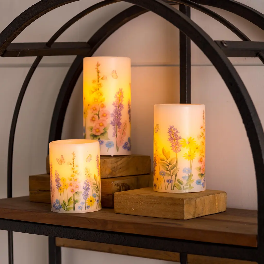 Flameless Pillar Candles With Floral Designs, Set Of 3